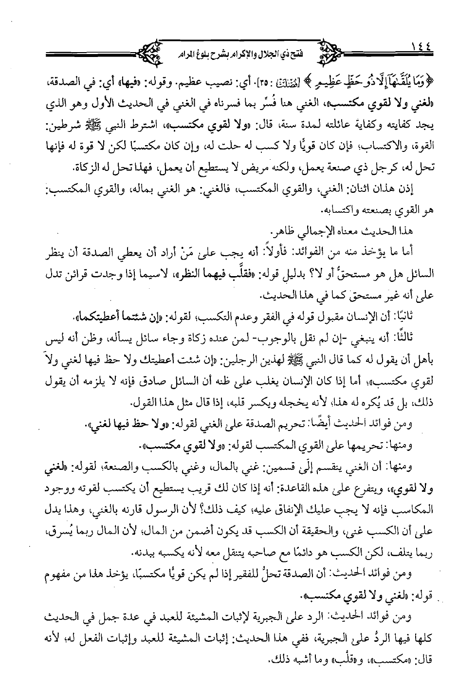 {وما يلقاها إلا ذو حظ عظيم} [فصلت: 35]. أي: نصيب عظيم. وقوله: "فيها" أي: في الصدقة، "لغني ولا لقوي مكتسب"، الغني هنا فسر بما فسرناه في الغني في الحديث الأول وهو الذي يجد كفايته وكفاية عائلته لمدة سنة، قال: "ولا لقوي مكتسب"، اشترط النبي صلى الله عليه وسلم شرطين: القوة، والاكتساب؛ فإن كان قويًّا ولا كسب له حلت له، وإن كان مكتسبًا لكن لا قوة له فإنها تحل له، كرجل ذي صنعة يعمل، ولكنه مريض لا يستطيع أن يعمل، فهذا تحل له الزكاة.