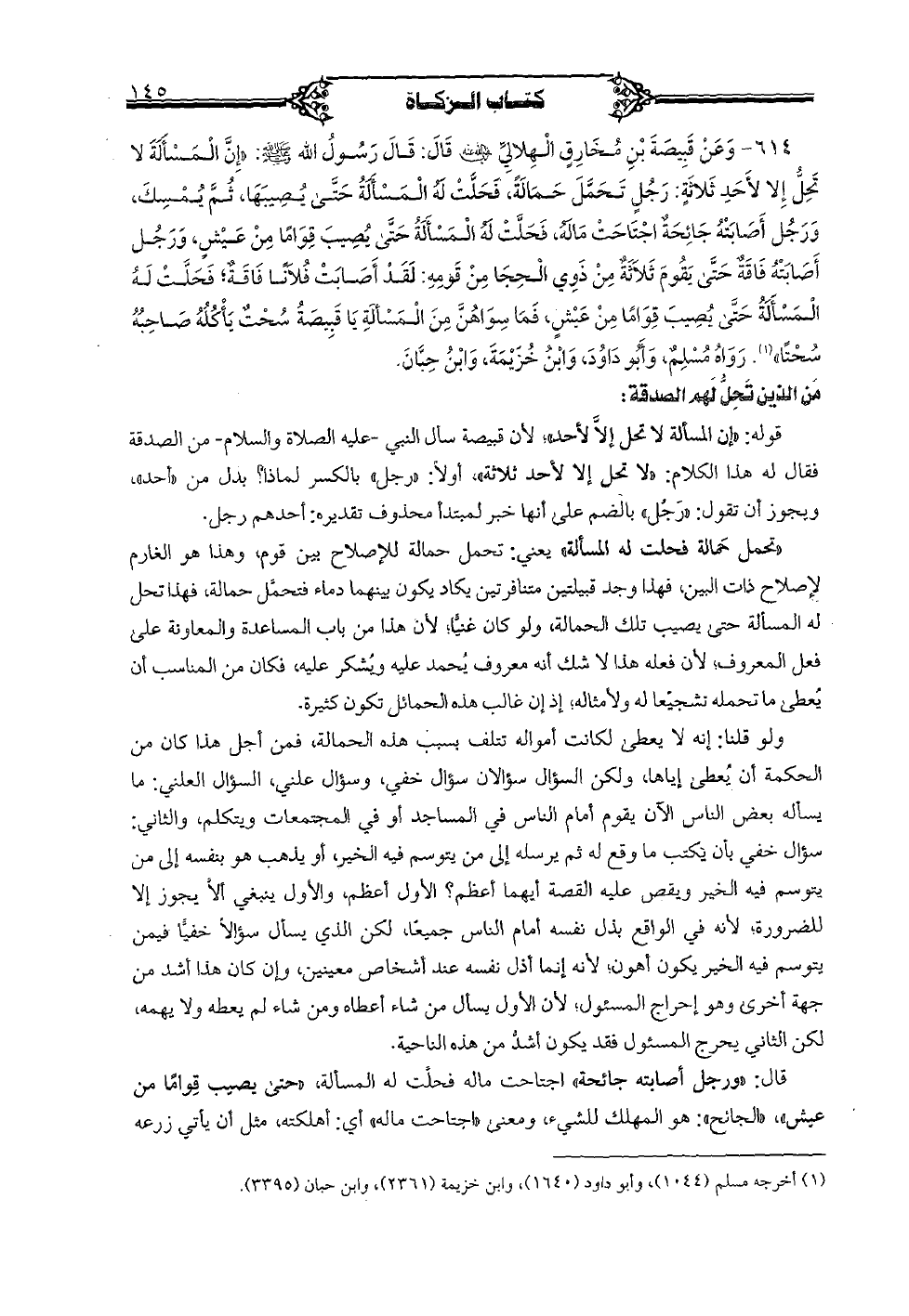 614 - وعن قبيصة بن مخارقٍ الهلاليِّ رضي الله عنه قال: قال رسول الله صلى الله عليه وسلم: "إنَّ المسألة لا تحل إلا لأحد ثلاثةٍ: رجل تحَّمل حمالةً، فحلت له المسألة حتى يصيبها، ثمَّ يمسك، ورجل أصابته جائحةٌ اجتاحت ماله، فحلَّت له المسألة حتى يصيب قوامًا من عيشٍ، ورجل أصابته فاقةٌ حتَّى يقوم ثلاثةٌ من ذوي الحجا من قومة: لقد أصابت فلانًا فاقةٌ؛ فحلَّت له المسألة حتى يصيب قوامًا من عيشٍ، فما سواهنَّ من المسألة يا قبيصة سحتٌ يأكله صاحبه سحتًا". رواه مسلمٌ، وأبو داود، وابن خزيمة، وابن حبَّان.