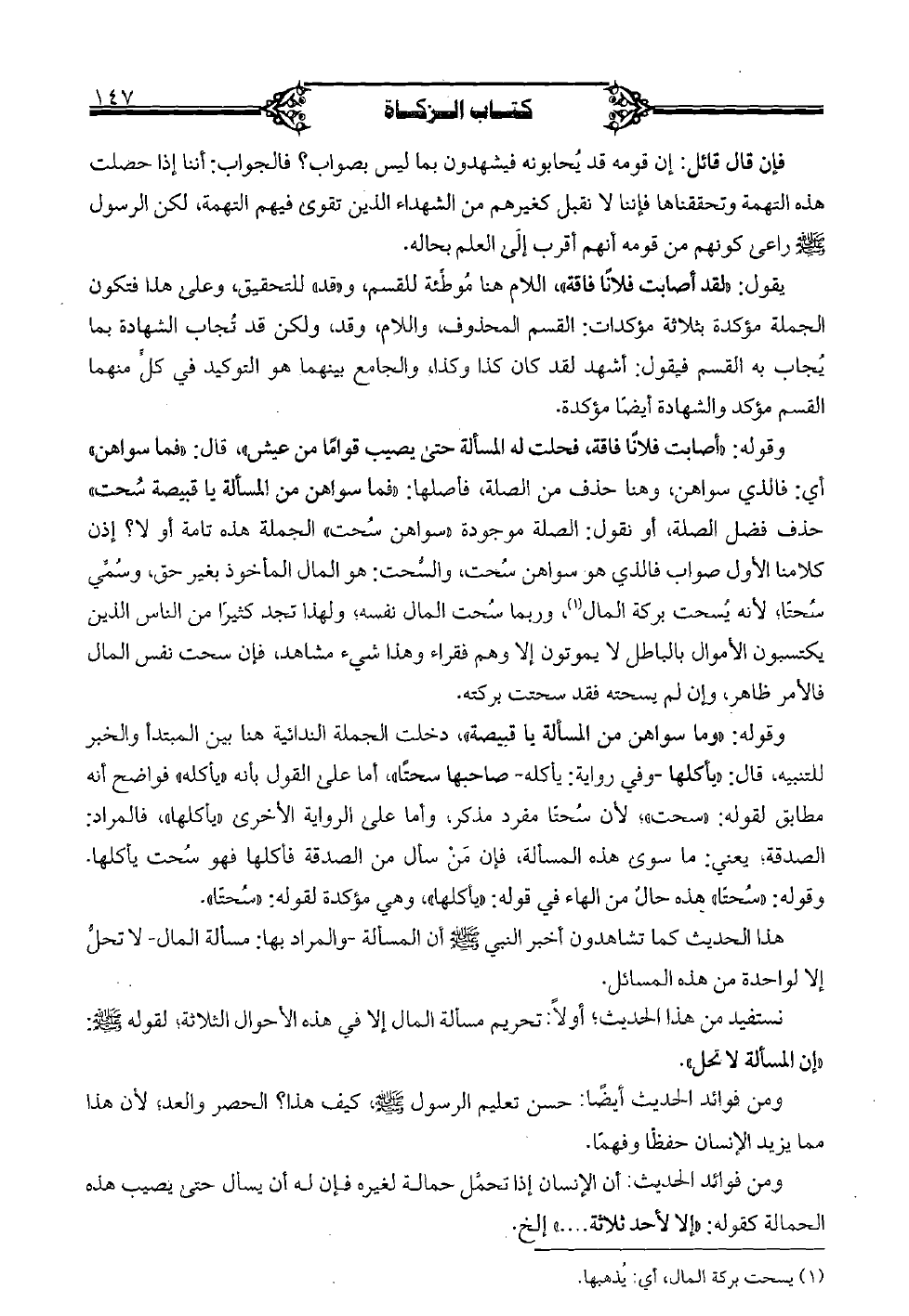 وقوله: "أصابت فلانًا فاقة، فحلت له المسألة حتى يصيب قواما من عيش"، قال: "فما سواهن" أي: فالذي سواهن، وهنا حذف من الصلة، فأصلها: "فما سواهن من المسألة يا قبيصة سحت" حذف فضل الصلة، أو نقول: الصلة موجودة "سواهن سنحت" الجملة هذه تامة أو لا؟ إذن كلامنا الأول صواب فالذي هو سواهن سحت، والسحت: هو المال المأخوذ بغير حق، وسميِّ سحتاّ؛ لأنه يسحت بركة المال، وربما سحت المال نفسه، ولهذا تجد كثيرًا من الناس الذين يكتسبون الأموال بالباطل لا يموتون إلا وهم فقراء وهذا شيء مشاهد، فإن سحت نفس المال فالأمر ظاهر، وإن لم يسحته فقد سحتت بركته.