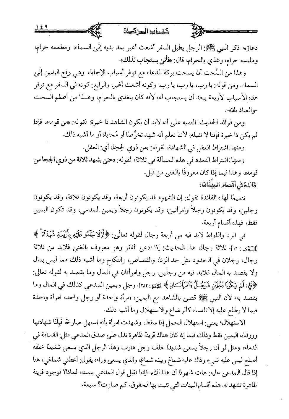 تتميمًا لهذه الفائدة نقول: إن الشهود قد يكونون أربعة، وقد يكونون ثلاثة، وقد يكونون رجلين، وقد يكونون رجلًا وامرأتين، وقد يكونون رجلًا ويمين المدعي، وقد تكون اليمين فقط، فهذه أقسام أربعة.