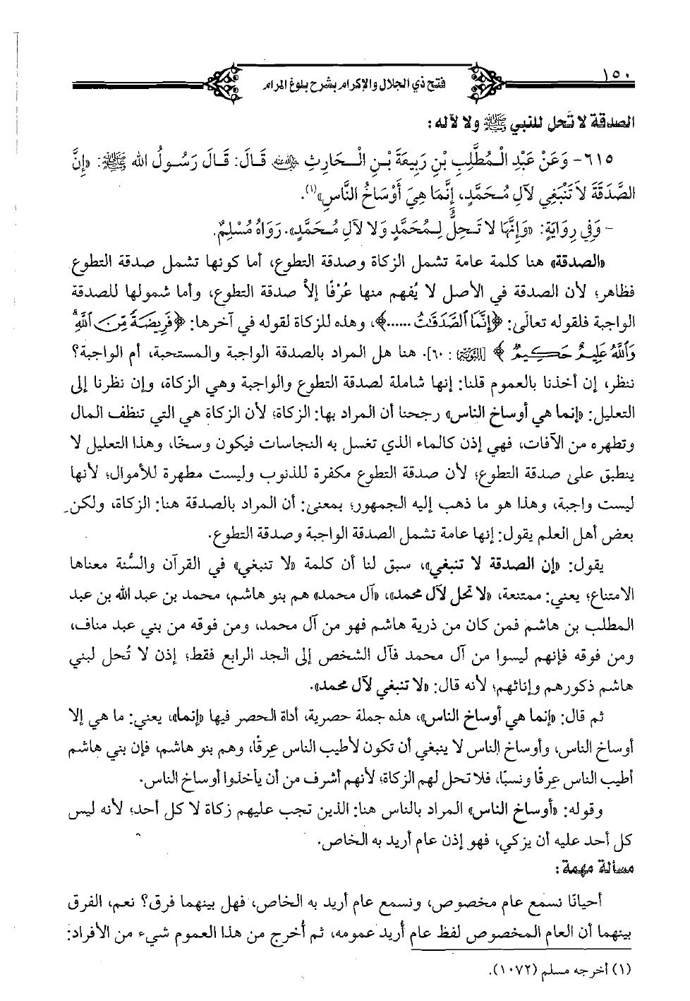 615 - وعن عبد المطَّلب بن ربيعة بن الحارث رضي الله عنه قال: قال رسول الله صلى الله عليه وسلم: "إنَّ الصَّدقة لا تنبغي لآل محمَّدٍ، إنَّما هي أوساخ النَّاس".