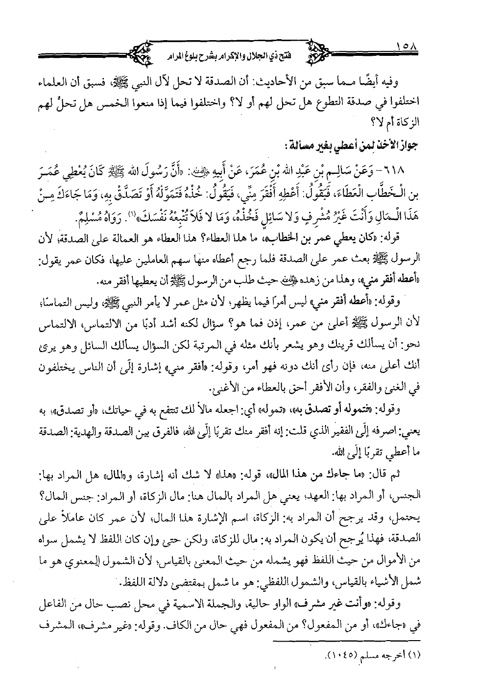 618 - وعن سالم بن عبد الله بن عمر، عن أبيه رضي الله عنه: "أنَّ رسول الله صلى الله عليه وسلم كان يعطي عمر بن الخطَّاب العطاء، فيقول: أعطه أفقر منِّي، فيقول: خذه فتموَّله أو تصدَّق به، وما جاءك من هذا المال وأنت غير مشرفٍ ولا سائلٍ فخذه، وما لا فلا تتبعه نفسك". رواه مسلم.