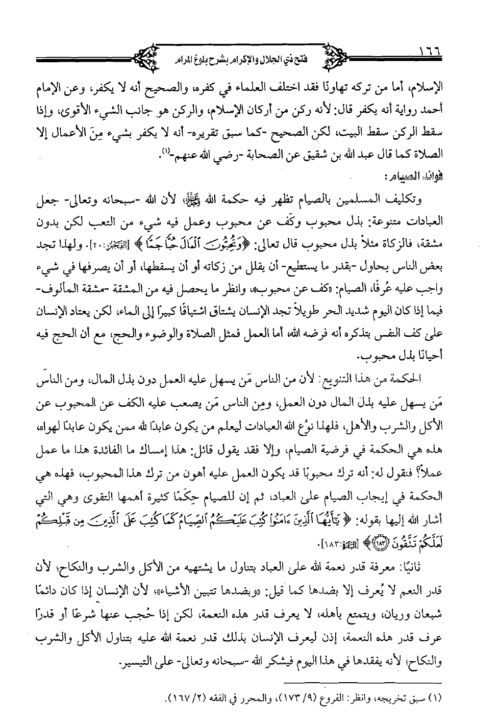 الإسلام، أما من تركه تهاونًا فقد اختلف العلماء في كفره، والصحيح أنه لا يكفر، وعن الإمام أحمد رواية أنه يكفر قال: لأنه ركن من أركان الإسلام، والركن هو جانب الشيء الأقوى، وإذا سقط الركن سقط البيت، لكن الصحيح- كما سبق تقريره- أنه لا يكفر بشيء من الأعمال إلا الصلاة كما قال عبد الله بن شقيق عن الصحابة- رضي الله عنهم-.