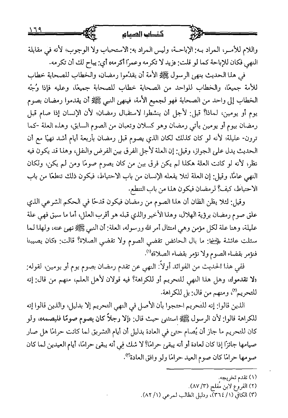 في هذا الحديث ينهى الرسول صلى الله عليه وسلم الأمة أن يقدِّموا رمضان، والخطاب للصحابة خطاب للأمة جميعًا، والخطاب للواحد من الصحابة خطاب للصحابة جميعًا، وعليه فإذا وجِّه الخطاب إلى واحد من الصحابة فهو لجميع الأمة، فينهى النبي صلى الله عليه وسلم أن يقدموا رمضان بصوم يوم أو يومين؛ لماذا؟ قيل: لأجل أن ينشطوا لاستقبال رمضان؛ لأن الإنسان إذا صام قبل رمضان بيوم أو يومين يأتي رمضان وهو كسلان وتعبان من الصوم السابق، وهذه العلة- كما ترون- عليلة؛ لأنه لو كان كذلك لكان الذي يصوم قبل رمضان بأربعة أيام أشد نهيًا مع أن الحديث يدل على الجواز، وقيل: إن العلة لأجل الفرق بين الفرض والنفل، وهذا قد يكون فيه نظر؛ لأنه لو كانت العلة هكذا لم يكن فرق بين من كان يصوم صومًا ومن لم يكن، ولكان النهي عامًا، وقيل: إن العلة لئلا يفعله الإنسان من باب الاحتياط، فيكون ذلك تنطعًا من باب الاحتياط، كيف؟ لرمضان فيكون هذا من باب التنطع.