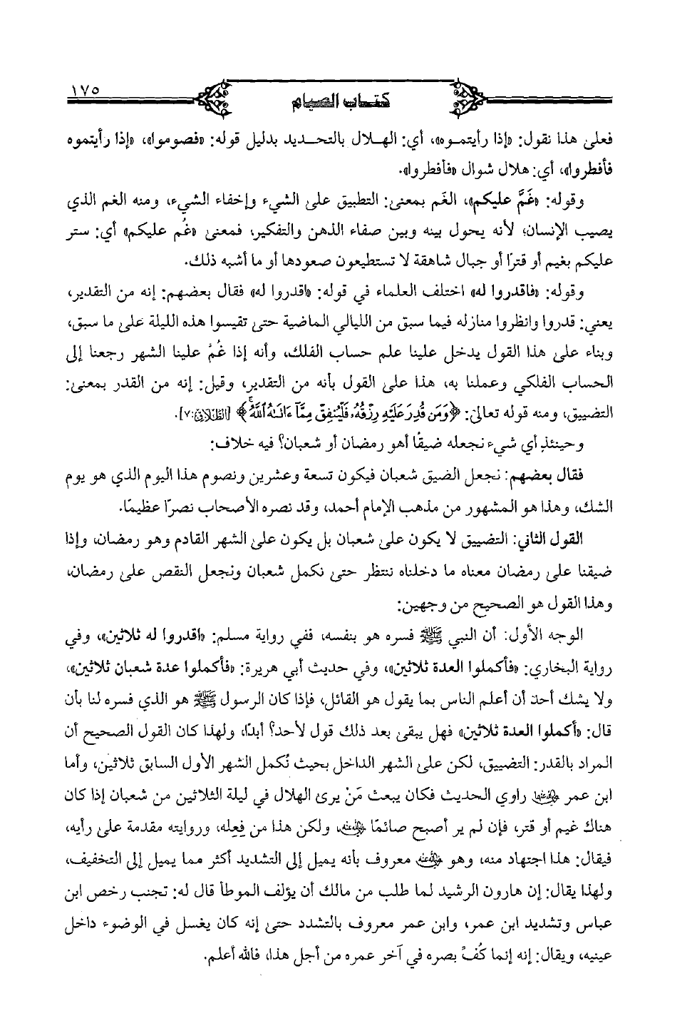 الوجه الأول: أن النبي صلى الله عليه وسلم فسره هو بنفسه، ففي رواية مسلم: "اقدروا له ثلاثين"، وفي رواية البخاري: "فأكملوا العدة ثلاثين"، وفي حديث أبي هريرة: "فأكملوا عدة شعبان ثلاثين، ولا يشك أحد أن أعلم الناس بما يقول هو القائل، فإذا كان الرسول صلى الله عليه وسلم هو الذي فسره لنا بأن قال: "أكملوا العدة ثلاثين" فهل يبقى بعد ذلك قول لأحد؟ أبدًا، ولهذا كان القول الصحيح أن المراد بالقدر: التضييق، لكن على الشهر الداخل بحيث نكمل الشهر الأول السابق ثلاثين، وأما ابن عمر رضي الله عنه راوي الحديث فكان يبعث من يرى الهلال في ليلة الثلاثين من شعبان إذا كان هناك غيم أو قتر، فإن لم ير أصبح صائما رضي الله عنه، ولكن هذا من فعله، وروايته مقدمة على رأيه، فيقال: هذا اجتهاد منه، وهو رضي الله عنه معروف بأنه يميل إلى التشديد أكثر مما يميل إلى التخفيف، ولهذا يقال: إن هارون الرشيد لما طلب من مالك أن يؤلف الموطأ قال له: تجنب رخص ابن عباس وتشديد ابن عمر، وابن عمر معروف بالتشدد حتى إنه كان يغسل في الوضوء داخل عينيه، ويقال: إنه إنما كفِّ بصره في آخر عمره من أجل هذا، فالله أعلم.