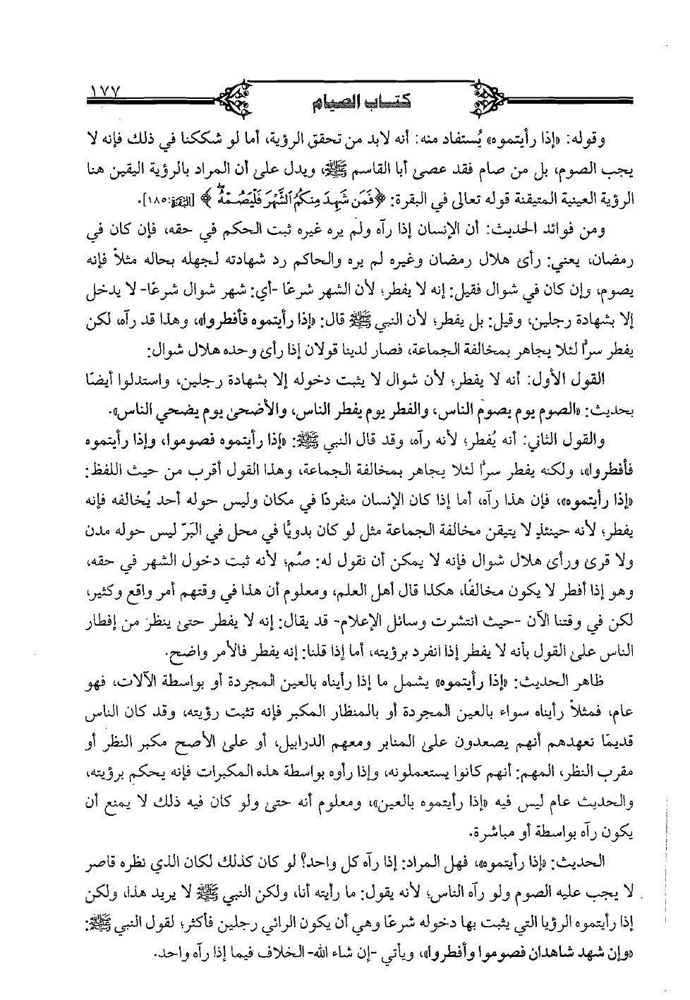 والقول الثاني: أنه يفطر؛ لأنه رآه، وقد قال النبي صلى الله عليه وسلم: "إذا رأيتموه فصوموا، وإذا رأيتموه فأفطروا"، ولكنه يفطر سرًّا لثلا يجاهر بمخالفة الجماعة، وهذا القول أقرب من حيث اللفظ: "إذا رأيتموه"، فإن هذا رآه، أما إذا كان الإنسان منفردًا في مكان وليس حوله أحد يخالفه فإنه يفطر؛ لأنه حينئذٍ لا يتيقن مخالفة الجماعة مثل لو كان بدويًّا في محل في البرّ ليس حوله مدن ولا قرى ورأى هلال شوال فإنه لا يمكن أن نقول له: صم: لأنه ثبت دخول الشهر في حقه، وهو إذا أفطر لا يكون مخالفًا، هكذا قال أهل العلم، ومعلوم أن هذا في وقتهم أمر واقع وكثير، لكن في وقتنا الآن- حيث انتشرت وسائل الإعلام- قد يقال: إنه لا يفطر حتى ينظر من إفطار الناس على القول بأنه لا يفطر إذا أنفرد برؤيته، أما إذا قلنا: إنه يفطر فالأمر واضح.