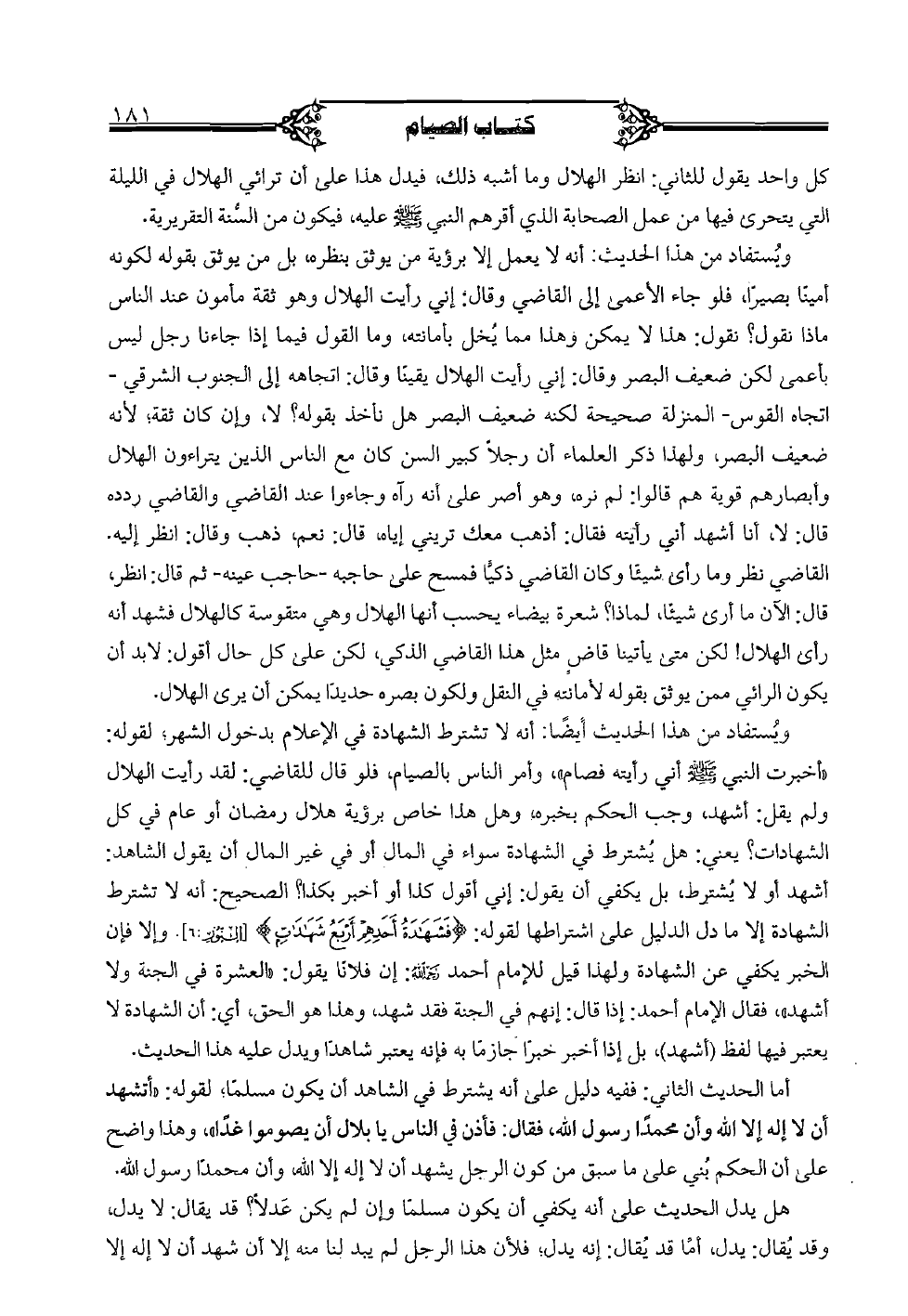 ويستفاد من هذا الحديث: أنه لا يعمل إلا برؤية من يوثق بنظره، بل من يوثق بقوله لكونه أمينا بصيرًا، فلو جاء الأعمى إلى القاضي وقال: إني رأيت الهلال وهو ثقة مأمون عند الناس ماذا نقول؟ نقول: هذا لا يمكن وهذا مما يخل بأمانته، وما القول فيما إذا جاءنا رجل ليس بأعمى لكن ضعيف البصر وقال: إنى رأيت الهلال يقينًا وقال: اتجاهه إلى الجنوب الشرقي- اتجاه القوس- المنزلة صحيحة لكنه ضعيف البصر هل نأخذ بقوله؟ لا، وإن كان ثقة؛ لأنه ضعيف البصر، ولهذا ذكر العلماء أن رجلًا كبير السن كان مع الناس الذين يتراءون الهلال وأبصارهم قوية هم قالوا: لم نره، وهو أصر على أنه رآه وجاءوا عند القاضي والقاضي ردده قال: لا، أنا أشهد أني رأيته فقال: أذهب معك تريني إياه، قال: نعم، ذهب وقال: أنظر إليه. القاضي نظر وما رأى شيئًا وكان القاضي ذكيًّا فمسح على حاجبه- حاجب عينه- ثم قال: انظر، قال: الآن ما أرى شيئا، لماذا؟ شعرة بيضاء يحسب أنها الهلال وهى متقوسة كالهلال فشهد أنه رأى الهلال! لكن متى يأتينا قاضٍ مثل هذا القاضي الذكي، لكن على كل حال أقول: لا بد أن يكون الرائي ممن يوثق بقوله لأمانته في النقل ولكون بصره حديدًا يمكن أن يرى الهلال.