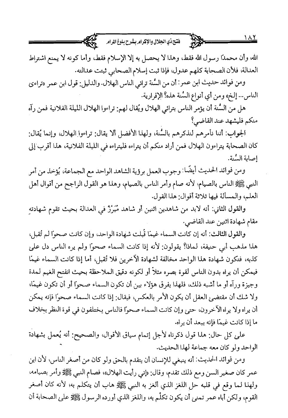 والقول الثالث: أنه إن كانت السماء غيمًا قبلت شهادة الواحد، وإن كانت صحوًا لم تقبل، هذا مذهب أبى حنيفة، لماذا؟ يقولون: لأنه إذا كانت السماء صحوًا ولم يره الناس دل على كذبه، فتكون شهادة هذا الواحد مخالفة لشهادة الآخرين فلا تقبل، أما إذا كانت السماء غيمًا فيمكن أن يراه بدون الناس لقوة بصره مثلًا أو لكونه دقيق الملاحظة بحيث انفتح الغيم لمدة وجيزة ورآه أو ما أشبه ذلك، فلهذا يفرق هؤلاء بين أن تكون السماء صحوا أو أن تكون غيمًا، ولا شك أن مقتضى العقل أن يكون الأمر بالعكس، فيقال: إذا كانت السماء صحوا فإنه يمكن أن يراه ولا يراه الآخرون، حتى وإن كانت السماء صحًوا فالناس يختلفون في قوة النظر بخلاف ما إذا كانت غيمًا فإنه يبعد أن يراه.