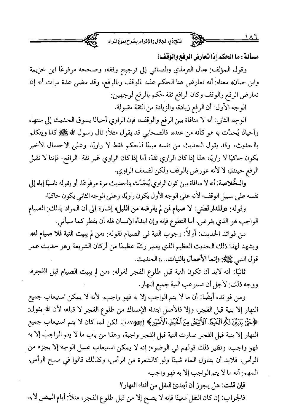 وقول المؤلف: "مال الترمذي والنسائي إلى ترجيح وقفه، وصححه مرفوعًا ابن خزيمة وابن حبان" معناه: أنه تعارض هنا الحكم عليه بالوقف وبالرفع، وقد مضى عدة مرات أنه إذا تعارض الرفع والوقف وكان الرافع ثقة حكم بالرفع لوجهين: