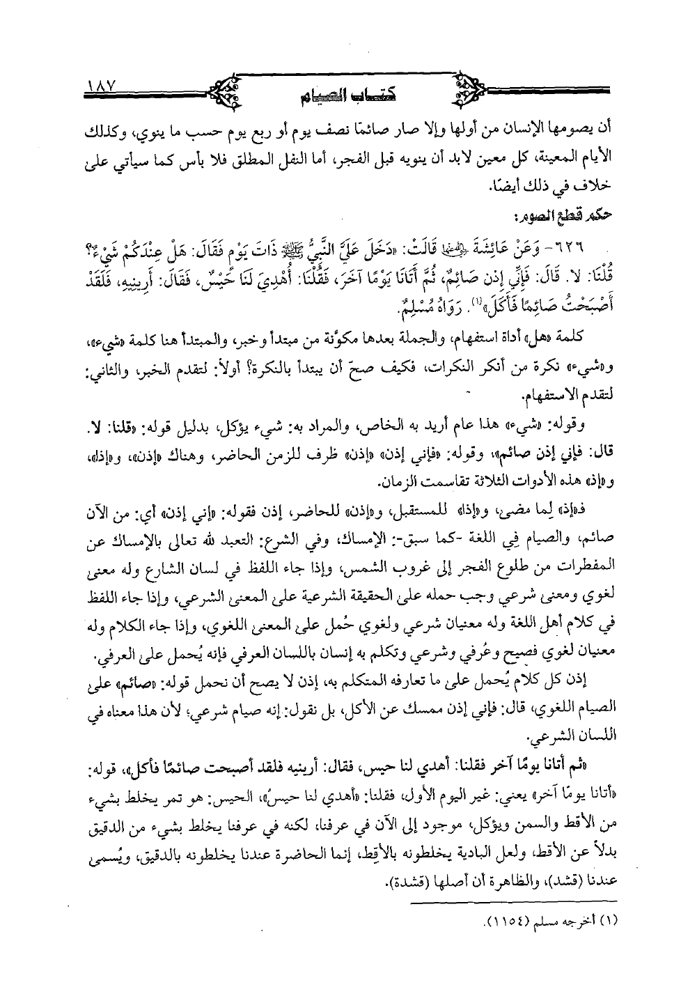 626 - وعن عائشة رضي الله عنها قالت: "دخل عليَّ النَّبيِّ صلى الله عليه وسلم ذات يوم فقال: هل عندكم شيءٌ؟ قلنا: لا. قال: فإنِّي إذن صائمٌ، ثمَّ أتانا يومًا آخر، فقلنا: أهدي لنا حيسٌ، فقال: أرينيه، فلقد أصبحت صائمًا فأكل". رواه مسلمٌ.