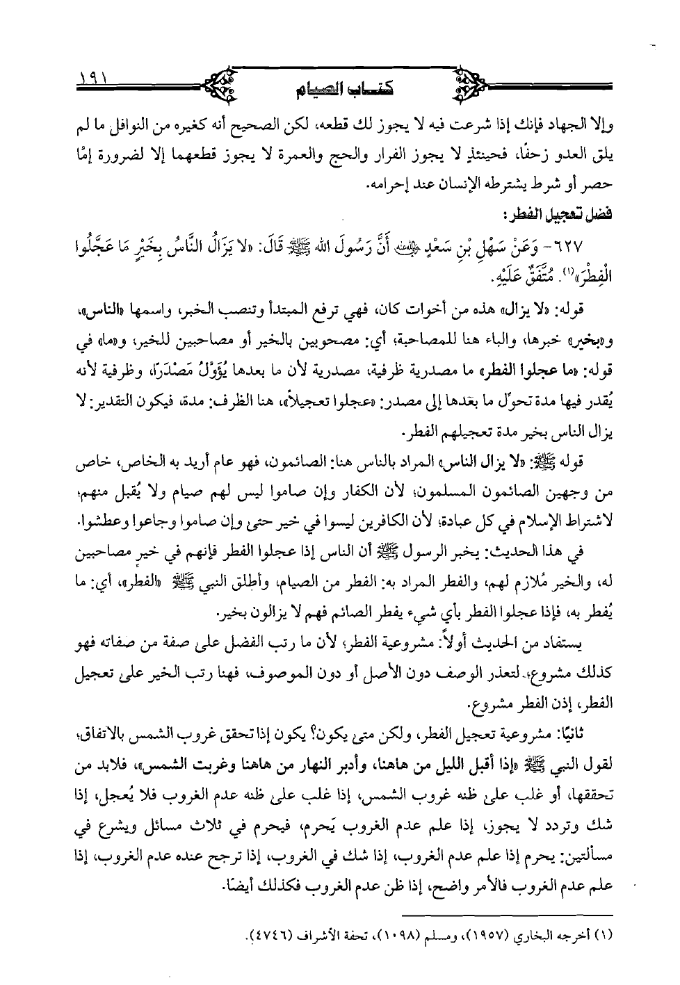 627 - وعن سهل بن سعدٍ رضي الله عنه أنَّ رسول الله صلى الله عليه وسلم قال: "لا يزال النَّاس بخيرٍ ما عجَّلوا الفطر". متَّفقٌ عليه.