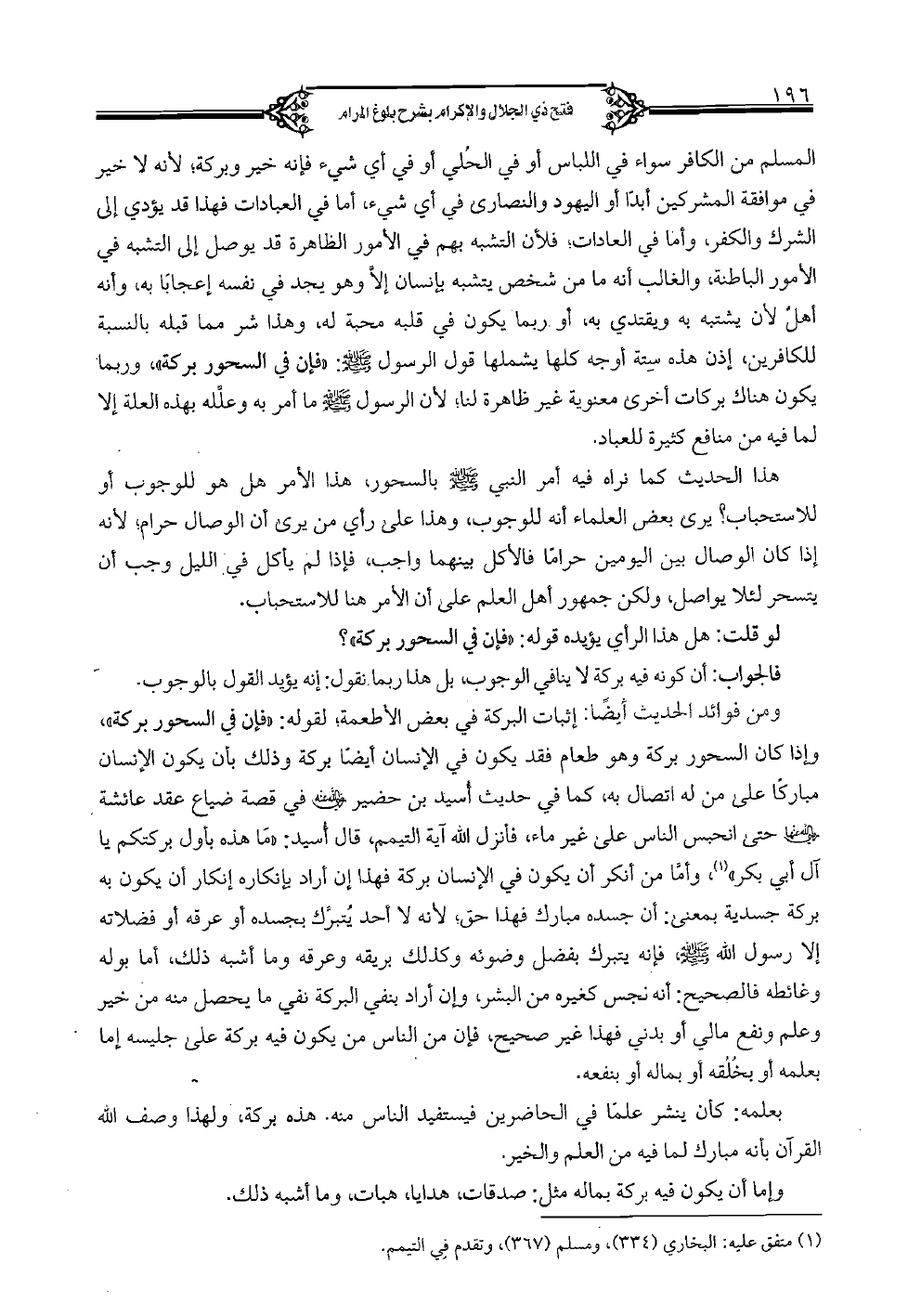 المسلم من الكافر سواء في اللباس أو في الحلي أو في أي شيء فإنه خير وبركة؛ لأنه لا خير في موافقة المشركين أبدًا أو اليهود والنصارى في أي شيء، أما في العبادات فهذا قد يؤدي إلى الشرك والكفر، وأما في العادات؛ فلأن التشبه بهم في الأمور الظاهرة قد يوصل إلى التشبه في الأمور الباطنة، والغالب أنه ما من شخص يتشبه بإنسان إلا وهو يجد في نفسه إعجابًا به، وأنه أهل لأن يشتبه به ويقتدي به، أو ربما يكون في قلبه محبة له، وهذا شر مما قبله بالنسبة للكافرين، إذن هذه ستة أوجه كلها يشملها قول الرسول صلى الله عليه وسلم: "فإن في السحور بركة"، وربما يكون هناك بركات أخرى معنوية غير ظاهرة لنا؛ لأن الرسول صلى الله عليه وسلم ما أمر به وعلَّله بهذه العلة إلا لما فيه من منافع كثيرة للعباد.