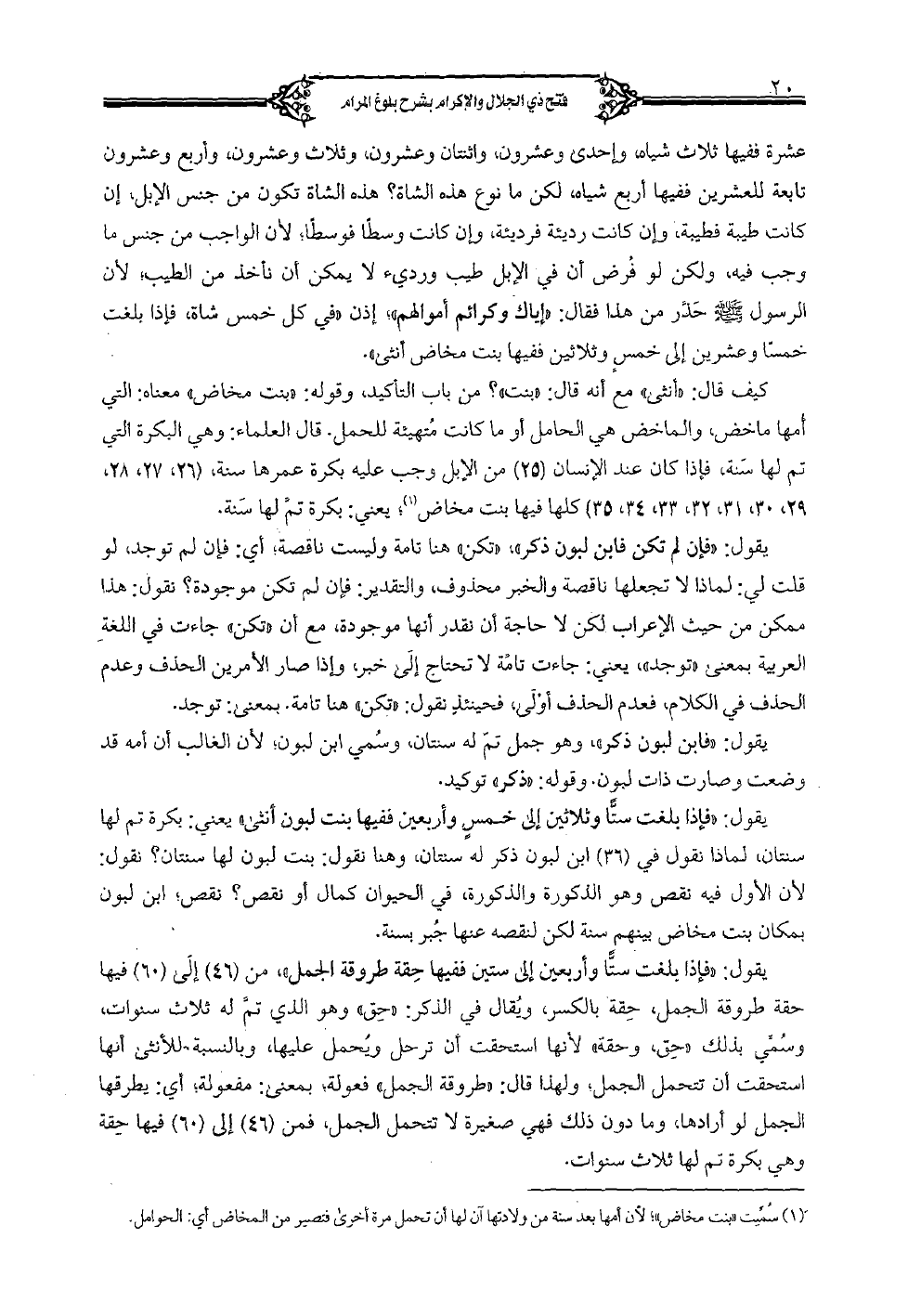 كيف قال: "أنثى" مع أنه قال: "بنت"؟ من باب التأكيد، وقوله: "بنت مخاض" معناه: التي أمها ماخض، والماخض هي الحامل أو ما كانت مُتهيئة للحمل. قال العلماء: وهي البكرة التي تم لها سنة، فإذا كان عند الإنسان (25) من الإبل وجب عليه بكرة عمرها سنة، (26، 27، 28، 29، 30، 31، 32، 33، 34، 35) كلها فيها بنت مخاض"؛ يعني: بكرة تم لها سنة.