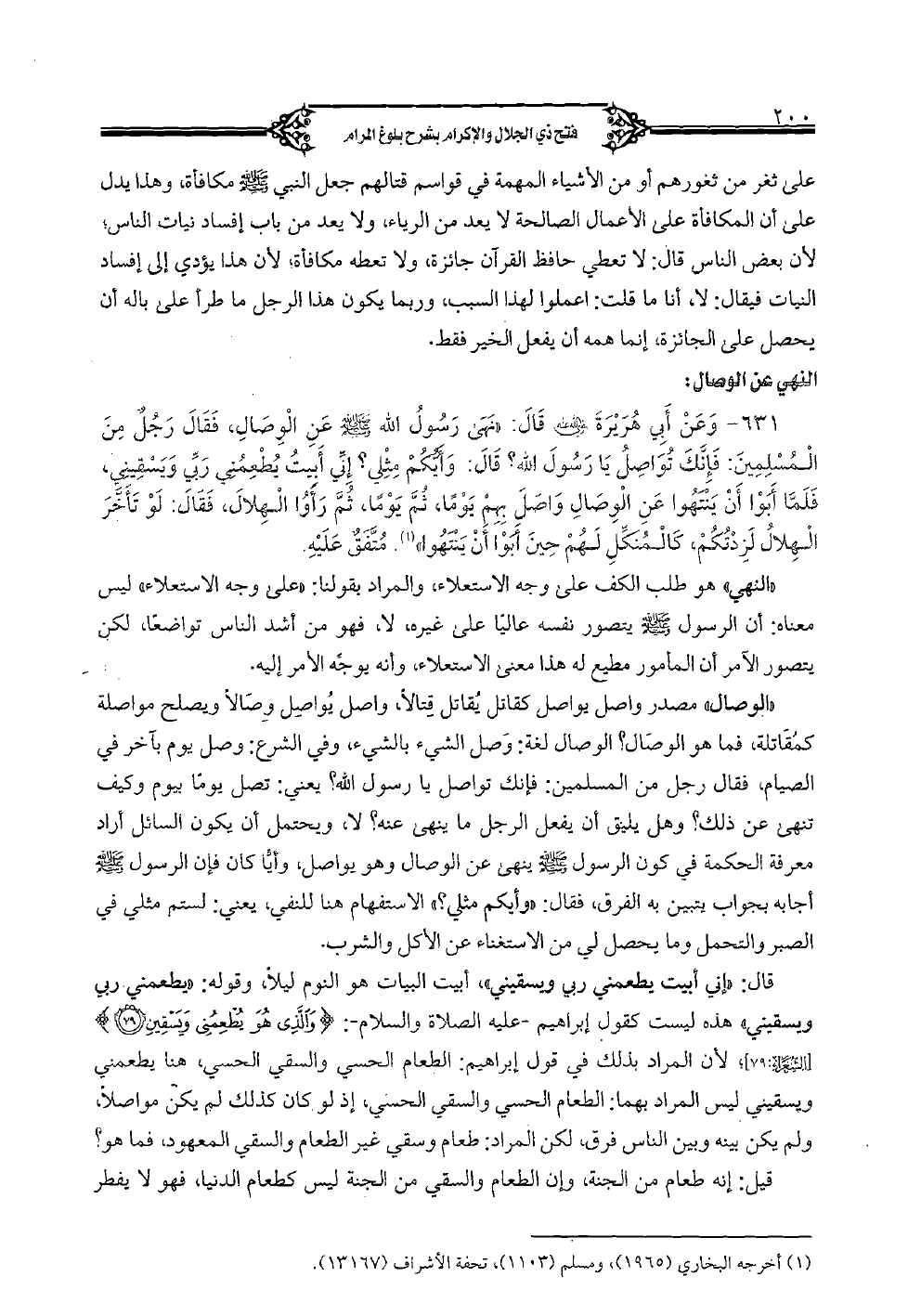 631 - وعن أبي هريرة رضي الله عنه قال: "نهى رسول الله صلى الله عليه وسلم عن الوصال، فقال رجلٌ من المسلمين: فإنك تواصل يا رسول الله قال: وأيكم مثلي؟ إنِّي أبيت يطعمني ربِّي ويسقيني، فلمَّا أبوا أن ينتهوا عن الوصال واصل بهم يومًا، ثمَّ يومًا، ثم رأوا الهلال، فقال: لو تأخر الهلال لزدتكم، كالمنكل لهم حين أبوا أن ينتهوا". متفقٌ عليه.