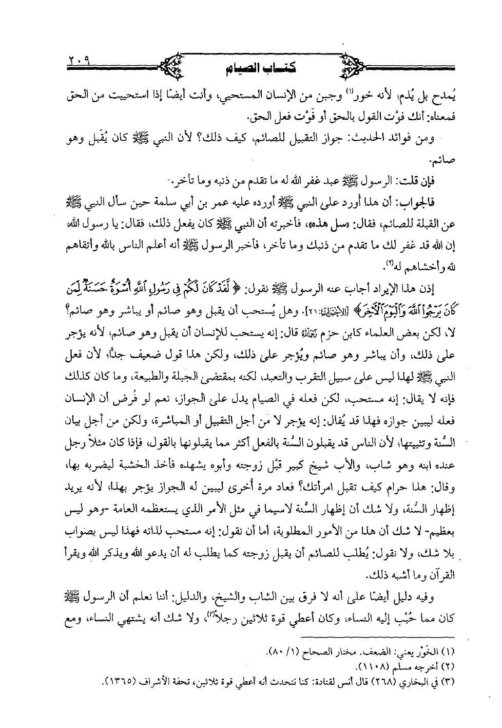 إذن هذا الإيراد أجاب عنه الرسول صلى الله عليه وسلم نقول: {لقد كان لكم في رسول الله أسوة حسنة لمن كان يرجوا الله واليوم الآخر} [الأحزاب: 21]. وهل يستحب أن يقبل وهو صائم أو يباشر وهو صائم؟ لا، لكن بعض العلماء كابن حزم رحمه الله قال: إنه يستحب للإنسان أن يقبل وهو صائم؛ لأنه يؤجر على ذلك، وأن يباشر وهو صائم ويؤجر على ذلك، ولكن هذا قول ضعيف جدًا؛ لأن فعل النبي صلى الله عليه وسلم لهذا على سبيل التقرب والتعبد، لكنه بمقتضى الجبلة والطبيعة، وما كان كذلك فإنه لا يقال: إنه مستحب، لكن فعله في الصيام يدل على الجواز، نعم لو فرض أن الإنسان فعله ليبين جوازه فهذا قد يقال: إنه يؤجر لا من أجل التقبيل أو المباشرة، ولكن من أجل بيان السنة وتثبيتها؛ لأن الناس قد يقبلون السُّنة بالفعل أكثر مما يقبلونها بالقول، فإذا كان مثلًا رجل عنده ابنه وهو شاب، والأب شيخ كبير قبل زوجته وأبوه يشهده فأخذ الخشبة ليضر به بها، وقال: هذا حرام كيف تقبل امرأتك؟ فعاد مرة أخرى ليبين له الجواز يؤجر بهذا؛ لأنه يريد إظهار السُّنة، ولاشك أن إظهار السُّنة لا سيما في مثل الأمر الذي يستعظمه العامة- وهو ليس بعظيم- لا شك، ولا نقول: يطلب للصائم أن يقبل زوجته كما يطلب له أن يدعو الله ويذكر الله ويقرأ القرآن وما أشبه ذلك.