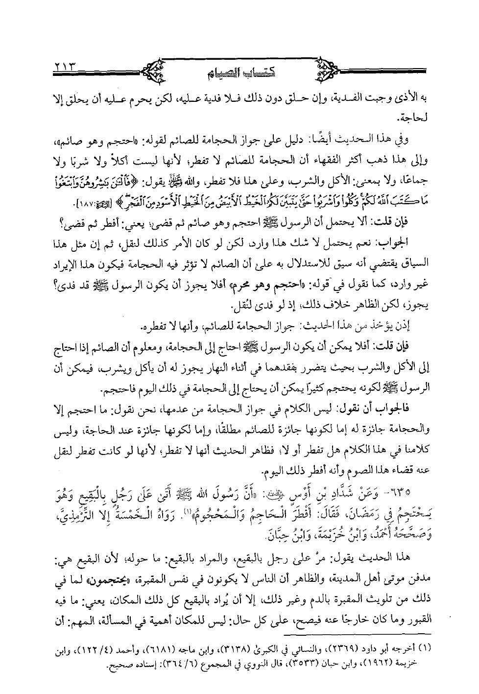 فالجواب أن نقول: ليس الكلام في جواز الحجامة من عدمها، نحن نقول: ما احتجم إلا والحجامة جائزة له إما لكونها جائزة للصائم مطلقًا، وإما لكونها جائزة عند الحاجة، وليس كلامنا في هذا الكلام هل تفطر أو لا؛ فظاهر الحديث أنها لا تفطر؛ لأنها لو كانت تفطر لنقل عنه قضاء هذا الصوم وأنه أفطر ذلك اليوم.