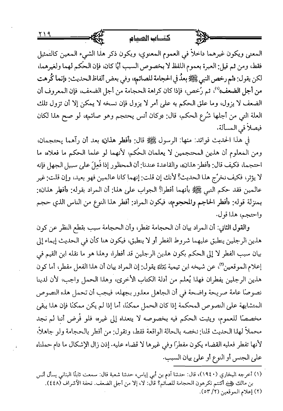 المعنى ويكون غيرهما داخلًا في العموم المعنوي، ويكون ذكر هذا الشيء المعين كالتمثيل فقط، ومن ثم قيل: العبرة بعموم اللفظ لا بخصوص السبب أيًا كان، فإن الحكم لهما ولغيرهما، لكن يقول: "ثم رخص النبي صلى الله عليه وسلم بعد في الحجامة للصائم"، وفي بعض ألفاظ الحديث: "إنما كرهت من أجل الضعف"، ثم رخص، فإذا كان كراهة الحجامة من أجل الضعف، فإن المعروف أن الضعف لا يزول، وما علق الحكم به على أمر لا يزول فإن نسخه لا يمكن إلا أن تزول تلك العلة التي من أجلها شرع الحكم، قال: "وكان أنس يحتجم وهو صائم"، لو صح هذا لكان فيصلًا في المسألة.