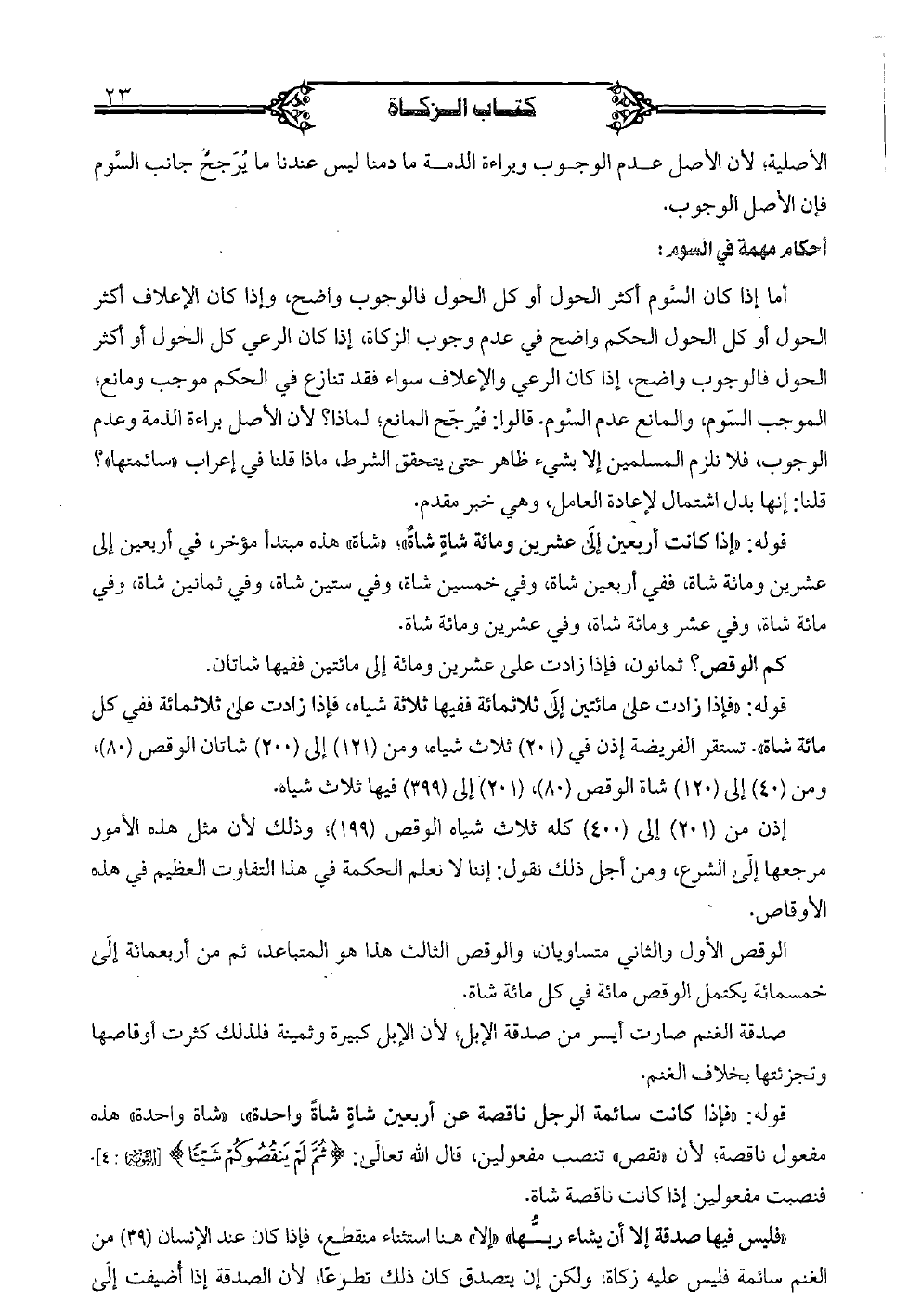 أما إذا كان السَّوم أكثر الحول أو كل الحول فالوجوب واضح، وإذا كان الإعلاف أكثر الحول أو كل الحول الحكم واضح في عدم وجوب الزكاة، إذا كان الرعي كل الحول أو أكثر الحول فالوجوب واضح، إذا كان الرعي والإعلاف سواء فقد تنازع في الحكم موجب ومانع؛ الموجب السّوم، والمانع عدم السَّوم. قالوا: فيرجّح المانع، لماذا؟ لأن الأصل براءة الذمة وعدم الوجوب، فلا نلزم المسلمين إلا بشيء ظاهر حتى يتحقق الشرط، ماذا قلنا في إعراب "سائمتها"؟ قلنا: إنها بدل اشتمال لإعادة العامل، وهي خبر مقدم.