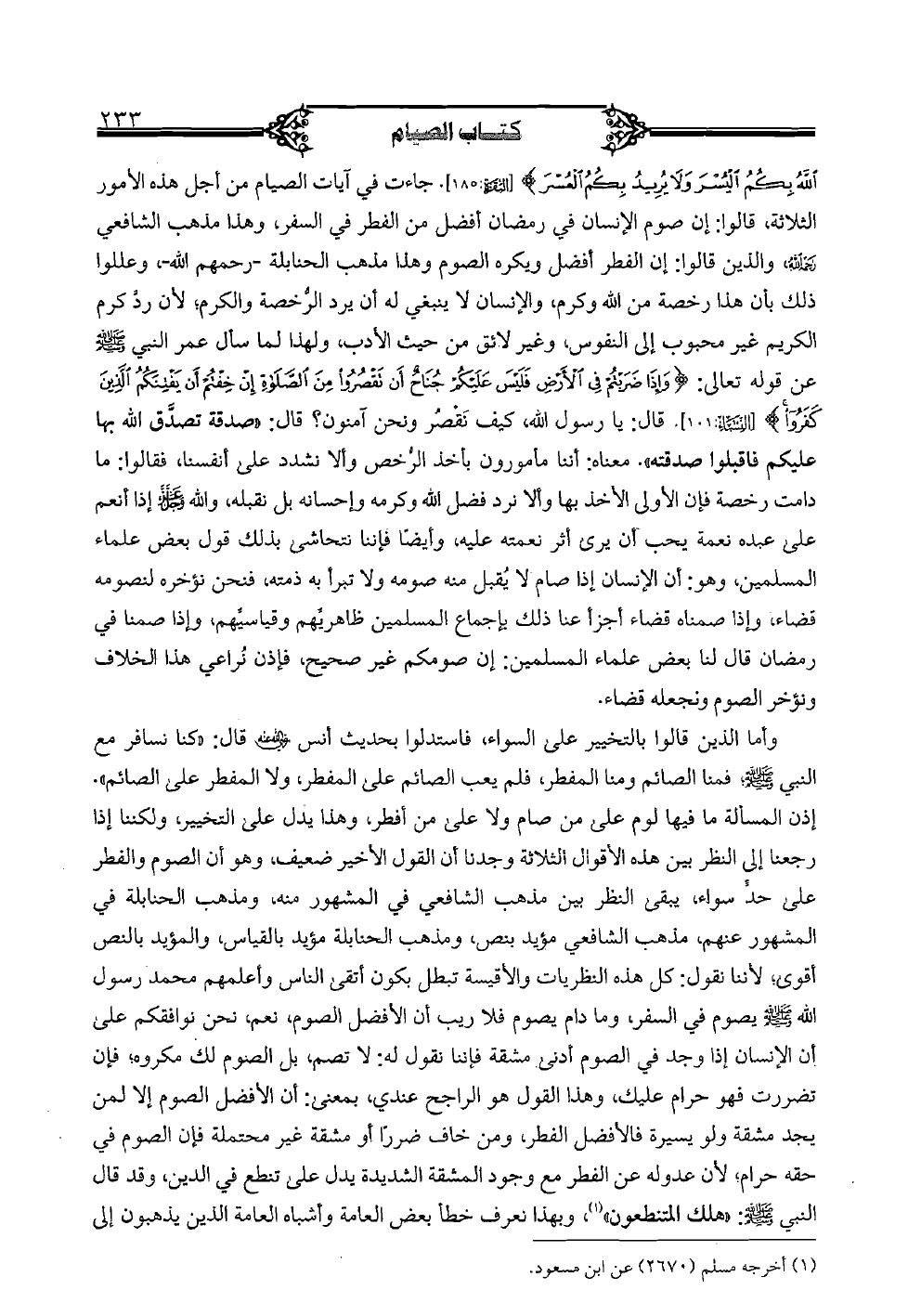 وأما الذين قالوا بالتخيير على السواء، فاستدلوا بحديث أنس رضي الله عنه: "كنا نسافر مع النبي"؛ فمنا الصائم ومنا المفطر، فلم يعب الصائم على المفطر، ولا المفطر على الصائم". إذن المسألة ما فيها لوم على من صام ولا على من أفطر، وهذا يدل على التخيير، ولكننا إذا رجعنا إلى النظر بين هذه الأقوال الثلاثة وجدنا أن القول الأخير ضعيف، وهو أن الصوم والفطر على حد سواء، يبقى النظر بين مذهب الشافعي في المشهور منه، ومذهب الحنابلة في المشهور عنهم، مذهب الشافعي مؤيد بنص، ومذهب الحنابلة مؤيد بالقياس، والمؤيد بالنص أقوى؛ لأننا نقول: كل هذه النظريات والأقيسة تبطل بكون أتقى الناس وأعلمهم محمد رسول الله صلى الله عليه وسلم يصوم في السفر، وما دام يصوم فلا ريب أن الأفضل الصوم، نعم، نحن نوافقكم على أن الإنسان إذا وجد في الصوم أدنى مشقة فإننا نقول له: لا تصم، بل الصوم لك مكروه؛ فإن تضررت فهو حرام عليك، وهذا القول هو الراجح عندي، بمعنى: أن الأفضل الصوم إلا لمن يجد مشقة ولو يسيرة فالأفضل الفطر، ومن خاف ضررًا أو مشقة غير محتملة فإن الصوم فيه حقه حرام؛ لأن عدوله فن الفطر مع وجود المشقة الشديدة يدل على تنطع في الدين، وقد قال النبي صلى الله عليه وسلم: "هلك المتنطعون"، وبهذا نعرف خطأ بعض العامة وأشباه العامة الذين يذهبون إلى