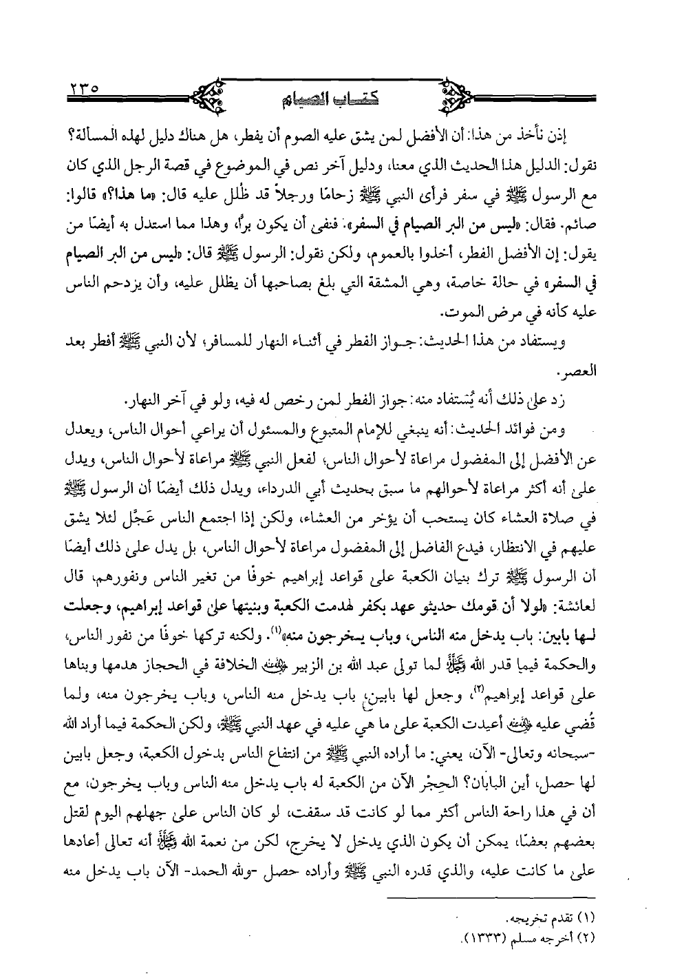 ومن فوائد الحديث: أنه ينبغي للإمام المتبوع والمسئول أن يراعي أحوال الناس، ويعدل عن الأفضل إلى المفضول مراعاة لأحوال الناس؛ لفعل النبي صلى الله عليه وسلم مراعاة لأحوال الناس، ويدل على أنه أكثر مراعاة لأحوالهم ما سبق بحديث أبي الدرداء، ويدل ذلك أيضًا أن الرسول صلى الله عليه وسلم في صلاة العشاء كان يستحب أن يؤخر من العشاء، ولكن إذا اجتمع الناس عجَّل لئلا يشق عليهم في الانتظار، فيدع الفاضل إلى المفضول مراعاة لأحوال الناس، بل يدل على ذلك أيضًا أن الرسول صلى الله عليه وسلم ترك بنيان الكعبة على قواعد إبراهيم خوفًا من تغير الناس ونفورهم، قال لعائشة: "لولا أن قومك حديثو عهد بكفر لهدمت الكعبة وبنيتها على قواعد إبراهيم، وجعلت لها بابين: باب يدخل منه الناس، وباب يخرجون منه". ولكنه تركها خوفًا من نفور الناس، والحكمة فيما قدر الله عز وجل لما تولى عبد الله بن الزبير رضي الله عنه الخلافة في الحجاز هدمها وبناها على قواعد إبراهيم، وجعل لها بابين، باب يدخل منه الناس، وباب يخرجون منه، ولما قضي عليه رضي الله عنه أعيدت الكعبة على ما هي عليه في عهد النبي صلى الله عليه وسلم، ولكن الحكمة فيما أراد الله - سبحانه وتعالى- الآن، يعني: ما أراده النبي صلى الله عليه وسلم من انتفاع الناس بدخول الكعبة، وجعل بابين لها حصل، أين البابان؟ الحجر الآن من الكعبة له باب يدخل منه الناس وباب يخرجون، مع أن في هذا راحة الناس أكثر مما لو كانت قد سقفت، لو كان الناس على جهلهم اليوم لقتل بعضهم بعضًا، يمكن أن يكون الذي يدخل لا يخرج، لكن من نعمة الله عز وجل أنه تعالى أعادها على ما كانت عليه، والذي قدره النبي صلى الله عليه وسلم وأراده حصل- ولله الحمد- الآن باب يدخل منه
