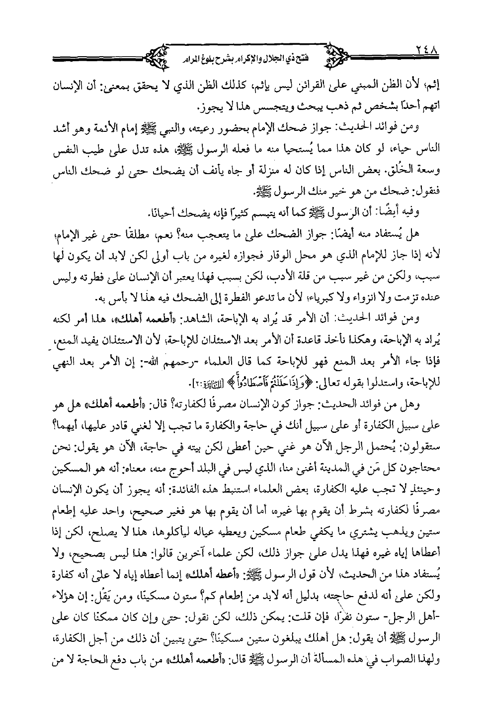 وهل من فوائد الحديث: جواز كون الإنسان مصرفًا لكفارته؟ قال: "أطعمه أهلك" هل هو على سبيل الكفارة أو على سبيل أنك في حاجة والكفارة ما تجب إلا لغني قادر عليها، أيهما؟ ستقولون: يحتمل الرجل الآن هو غني حين أعطى لكن بيته في حاجة، الآن هو يقول: نحن محتاجون كل من في المدينة أغنى منا، الذي ليس في البلد أحوج منه، معناه: أنه هو المسكين وحينئذٍ لا تجب عليه الكفارة، بعض العلماء استنبط هذه الفائدة: أنه يجوز أن يكون الإنسان مصرفًا لكفارته بشرط أن يقوم بها غيره، أما أن يقوم بها هو فغير صحيح، واحد عليه إطعام ستين ويذهب يشتري ما يكفي طعام مسكين ويعطيه عياله ليأكلوها، هذا لا يصلح، لكن إذا أعطاها إياه غيره فهذا يدل على جواز ذلك، لكن علماء آخرين قالوا: هذا ليس بصحيح، ولا يستفاد هذا من الحديث لأن قول الرسول صلى الله عليه وسلم: "أعطه أهلك" إنما أعطاه إياه لا على أنه كفارة ولكن على أنه لدفع حاجته، بدليل أنه لا بد من إطعام كم؟ ستون مسكينًا، ومن يقل: إن هؤلاء- أهل الرجل- ستون نفرًا، فإن قلت: يمكن ذلك، لكن نقول: حتى وإن كان ممكنًا كان على الرسول صلى الله عليه وسلم أن يقول: هل أهلك يبلغون ستين مسكينًا؟ حتى يتبين أن ذلك من أجل الكفارة، ولهذا الصواب في هذه المسألة أن الرسول صلى الله عليه وسلم قال: "أطعمه أهلك" من باب دفع الحاجة لا من