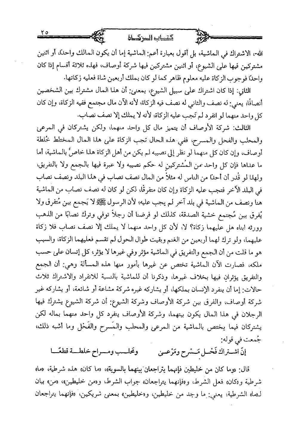 الثالث: شركة الأوصاف أن يتميز مال كل واحد منهما، ولكن يشتركان في المرعى والمحلب والفحل والمسرح، ففي هذه الحال تجب الزكاة على هذا المال المختلط خلطة أوصاف، وإن كان كل منهما لو نظر إلى نصيبه لم يكن من أهل الزكاة هذا خاصٌّ بالماشية، أما ما عداها فإن كل واحد من المشتركين له حكم نصيبه ولا عبرة فيها بالجمع ولا بالتفريق، ولهذا لو قُدر أن أحدًا من الناس له مثلًا من المال نصف نصاب في هذا البلد ونصف نصاب في البلد الآخر فتجب عليه الزكاة وإن كان متفرقًا، لكن لو كان له نصف نصاب من الماشية هنا ونصف من الماشية في بلد آخر لم يجب عليه؛ لأن الرسول صلى الله عليه وسلم لا يجمع بين مُتفرق ولا يفرق بين مُجتمع خشية الصدقة، كذلك لو فرضنا أن رجلًا توفي وترك نصابًا من الذهب وورثه ابناه هل عليهما زكاة؟ لا؛ لأن كل واحد منهما لا يملك إلا تصف نصاب فلا زكاة عليهما، ولو ترك لهما أربعين من الغنم وبقيت طوال الحول لم تقسم فعليهما الزكاة، والسبب هو ما قلت من أن الجمع والتفريق في الماشية مؤثر وفي غيرها لا يؤثر، كل إنسان على حسب ملكه، فصارت الآن الماشية تختص عن غيرها بأمور منها هذه المسألة وهي: أن الجمع والتفريق يؤثران فيها بخلاف غيرها، وذكرنا أن للماشية بالنسبة للانفراد والاشتراك ثلاث حالات: إما أن ينفرد الإنسان بملكها، أو يشاركه غيره شركة مشاعة أو شائعة، أو يشاركه غير شركة أوصاف، والفرق بين شركة الأوصاف وشركة الشيوع: أن شركة الشيوع يشترك فيها الرجلان في هذا المال يكون بينهما، وشركة الأوصاف ينفرد كل واحد منهما بماله لكن يشتركان فيما يختص بالماشية من المرعى والمحلب والمسرح والفحل وما أشبه ذلك، جُمعت في قوله: