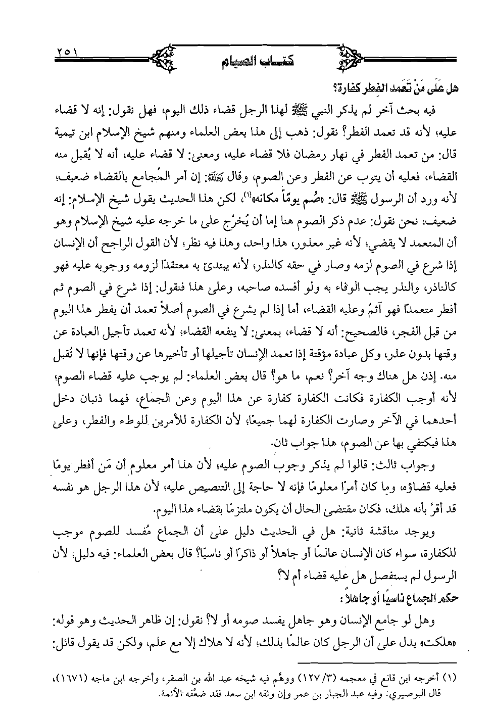 فيه بحث آخر لم يذكر النبي صلى الله عليه وسلم لهذا الرجل قضاء ذلك اليوم، فهل نقول: إنه لا قضاء عليه؛ لأنه قد تعمد الفطر؟ نقول: ذهب إلى هذا بعض العلماء ومنهم شيخ الإسلام ابن تيمية قال: من تعمد الفطر في نهار رمضان فلا قضاء عليه، ومعنى: لا قضاء عليه، أنه لا يقبل منه القضاء، فعليه أن يتوب عن الفطر وعن الصوم، وقال رحمه الله: إن أمر المجامع بالقضاء ضعيف؛ لأنه ورد أن الرسول صلى الله عليه وسلم قال: "صم يومًا مكانه"، لكن هذا الحديث يقول سيخ الإسلام: إنه ضعيف، نحن نقول: عدم ذكر الصوم هنا إما أن يخرَّج على ما خرجه عليه شيخ الإسلام وهو أن المتعمد لا يقضي؛ لأنه غير معذور، هذا واحد، وهذا فيه نظر؛ لأن القول الراجح أن الإنسان إذا شرع في الصوم لزمه وصار في حقه كالنذر؛ لأنه يبتدئ به معتقدًا لزومه ووجوبه عليه فهو كالناذر، والنذر يجب الوفاء به ولو أفسده صاحبه، وعلى هذا فنقول: إذا شرع في الصوم ثم أفطر متعمدًا فهو آثم وعليه القضاء، أما إذا لم يشرع في الصوم أصلًا تعمد أن يفطر هذا اليوم من قبل الفجر، فالصحيح: أنه لا قضاء، بمعنى: لا ينفعه القضاء؛ لأنه تعمد تأجيل العبادة عن وقتها بدون عذر، وكل عبادة مؤقتة إذا تعمد الإنسان تأجيلها أو تأخيرها عن وقتها فإنها لا تقبل منه. إذن هل هناك وجه آخر؟ نعم، ما هو؟ قال بعض العلماء: لم يوجب عليه قضاء الصوم؛ لأنه أوجب الكفارة فكانت الكفارة كفارة عن هذا اليوم وعن الجماع، فهما ذنبان دخل أحدهما في الآخر وصارت الكفارة لهما جميعًا؛ لأن الكفارة للأمرين للوطء والفطر، وعلى هذا فيكتفي بها عن الصوم، هذا جواب ثانٍ.