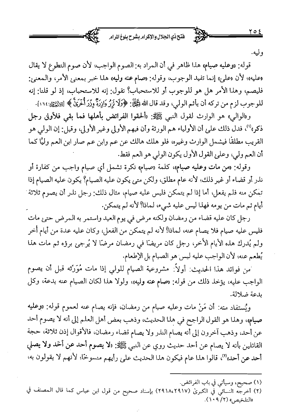 قوله: "وعليه صيام" هذا ظاهر في أن المراد به: الصوم الواجب؛ لأن صوم التطوع لا يقال "عليه"؛ لأن "على" إنما تفيد الوجوب، وقوله: "صام عنه وليه" هذا خبر بمعنى الأمر، والمعنى: فليصم، وهذا الأمر هل هو للوجوب أو للاستحباب؟ نقول: إنه للاستحباب، إذ لو قلنا: إنه للوجوب لزم من تركه أن يأثم الولي، وقد قال الله عز وجل: {ولا تزر وازرةٌ وزر أخرى} [الأنعام: 164].
