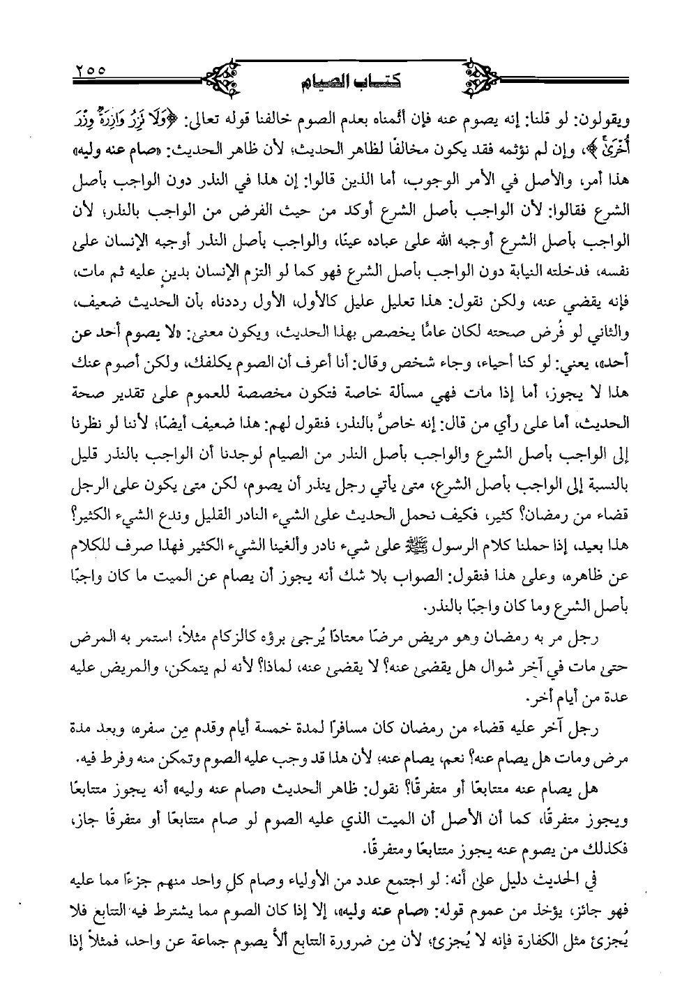 ويقولون: لو قلنا: إنه يصوم عنه فإن أثَّمناه بعدم الصوم خالفنا قوله تعالى: {ولا تزر وازرةٌ وزر أخرى}، وإن لم نؤثمه فقد يكون مخالفًا لظاهر الحديث؛ لأن ظاهر الحديث: "صام عنه وليه" هذا أمر، والأصل في الأمر الوجوب، أما الذين قالوا: إن هذا في النذر دون الواجب بأصل الشرع فقالوا: لأن الواجب بأصل الشرع أوكد من حيث الفرض من الواجب بالنذر؛ لأن الواجب بأصل الشرع أوجبه الله على عباده عينًا، والواجب بأصل النذر أوجبه الإنسان على نفسه، فدخلته النيابة دون الواجب بأصل الشرع فهو كما لو التزم الإنسان بدينٍ عليه ثم مات، فإنه يقضي عنه، ولكن نقول: هذا تعليل عليل كالأول، الأول رددناه بأن الحديث ضعيف، والثاني لو فرض صحته لكان عامًّا يخصص بهذا الحديث، ويكون معنى: "لا يصوم أحد عن أحد"، يعني: لو كنا أحياء، وجاء شخص وقال: أنا أعرف أن الصوم يكلفك، ولكن أصوم عنك هذا لا يجوز، أما إذا مات فهي مسألة خاصة فتكون مخصصة للعموم على تقدير صحة الحديث، أما على رأي من قال: إنه خاصٌ بالنذر، فنقول لهم: هذا ضعيف أيضًا؛ لأننا لو نظرنا إلى الواجب بأصل الشرع والواجب بأصل النذر من الصيام لوجدنا أن الواجب بالنذر قليل بالنسبة إلى الواجب بأصل الشرع، متى يأتي رجل ينذر أن يصوم، لكن متى يكون على الرجل قضاء من رمضان؟ كثير، فكيف نحمل الحديث على الشيء النادر القليل وندع الشيء الكثير؟ هذا بعيد، إذا حملنا كلام الرسول صلى الله عليه وسلم على شيء نادر وألغينا الشيء الكثير فهذا صرف للكلام عن ظاهره، وعلى هذا فنقول: الصواب بلا شك أنه يجوز أن يصام عن الميت ما كان واجبًا بأصل الشرع وما كان واجبًا بالنذر.