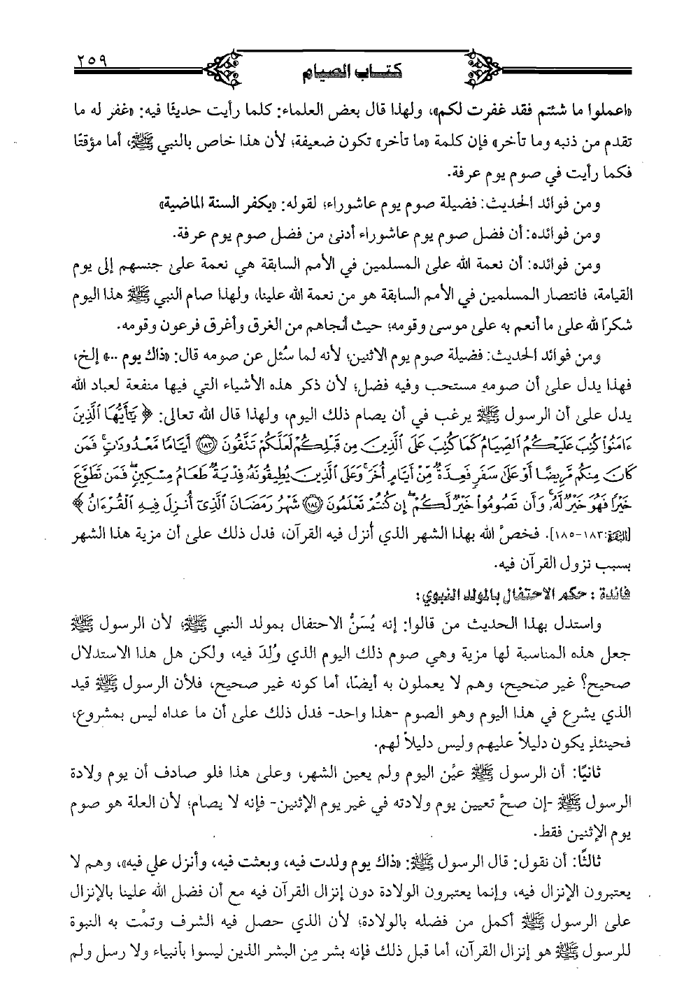 واستدل بهذا الحديث من قالوا: إنه يُسَنُّ الاحتفال بمولد النبي صلى الله عليه وسلم؛ لأن الرسول صلى الله عليه وسلم جعل هذه المناسبة لها مزية وهي صوم ذلك اليوم الذي وُلِدَ فيه، ولكن هل هذا الاستدلال صحيح؟ غير صحيح، وهم لا يعلمون به أيضًا، أما كونه غير صحيح، فلأن الرسول صلى الله عليه وسلم قيد الذي يشرع في هذا اليوم وهو الصوم- هذا واحد- فدل ذلك على أن ما عداه ليس بمشروع، فحينئذٍ يكون دليلًا عليهم وليس دليلًا لهم.