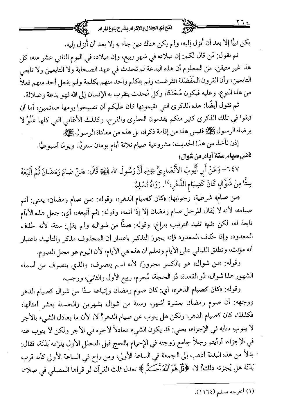 647 - وَعَن أَبِي أَيُّوبَ الأَن صَارِيِّ رضي الله عنه أَنَّ رَسُولَ الله صلى الله عليه وسلم قَالّ: "مَن صَامَ رَمَضَانَ ثُمَّ أَت بَعَهُ سِتًّا مِن شَوَّالٍ كَانَ كَصِيَامِ الدَّهرِ". رَوَاهُ مُسلِمٌ.