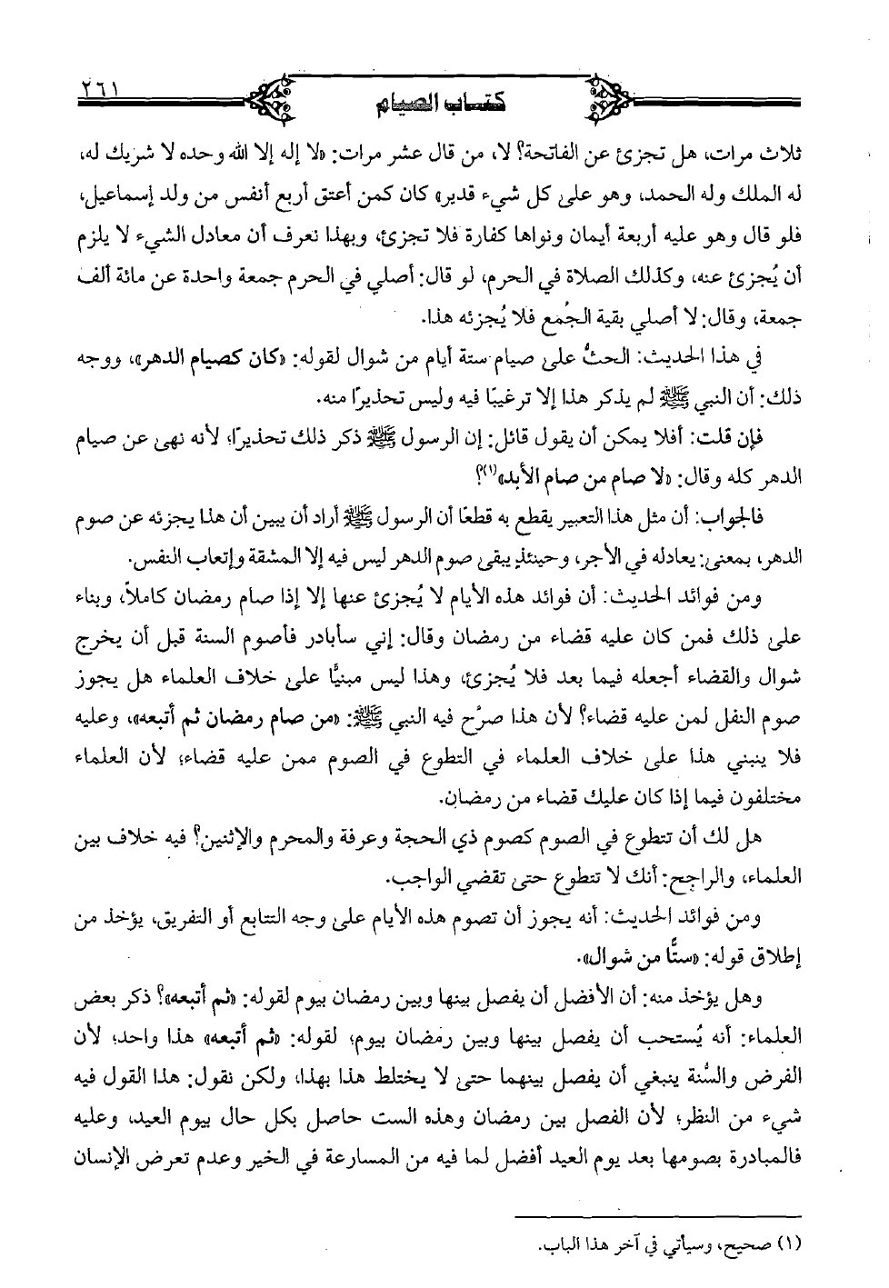 ومن فوائد الحديث: أن فوائد هذه الأيام لا يجزئ عنها إلا إذا صام رمضان كاملًا، وبناء على ذلك فمن كان عليه قضاء من رمضان وقال: إني سأبادر فأصوم السنة قبل أن يخرج شوال والقضاء أجعله فيما بعد فلا يجزئ، وهذا ليس مبنيًّا على خلاف العلماء هل يجوز صوم النفل لمن عليه قضاء؟ لأن هذا صرح فيه النبي صلى الله عليه وسلم: "من صام رمضان ثم أتبعه"، وعليه فلا ينبني هذا على خلاف العلماء في التطوع في الصوم ممن عليه قضاء؛ لأن العلماء مختلفون فيما إذا كان عليك قضاء من رمضان.