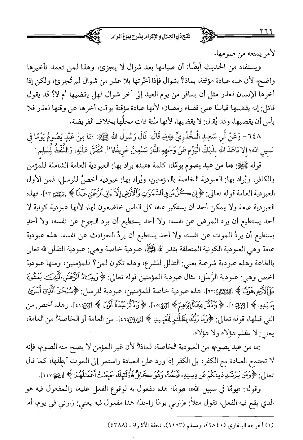 قوله صلى الله عليه وسلم: "ما من عبد يصوم يومًا"، كلمة "عبد" يراد بها: العبودية العامة الشاملة للمؤمن والكافر، ويراد بها: العبودية الخاصة بالمؤمنين، ويراد بها: عبودية أخصُّ للرسل، فمن الأول العبودية العامة قوله تعالى: {إن كل من في السموات والأرض إلا ءاتى الرحمن عبدًا} [مريم: 93]. فهذه العبودية عامة ولا يمكن أحد أن يستكبر عنه، كل الناس خاضعون لها؛ لأنها عبودية كونية لا أحد أن يستطيع أن يرد المرض نفسه، ولا أحد يستطيع أن يرد الجوع عن نفسه، ولا أحد يستطيع أن يردَّ الموت عن نفسه، ولا أحد يستطيع أن يردَّ الحوادث عن نفسه، هذه عبودية عامة وهي العبودية الكونية المتعلقة بقدر الله عز وجل، عبودية خاصة وهي: عبودية التذلل لله تعالى بالطاعة وهذه عبودية شرعية يعني: التذلل للشرع، وهذه تكون لمن؟ للمؤمنين، ومنها عبودية أخص وهي: عبودية الرُّسل، مثال عبودية المؤمنين قوله تعالى: {وعباد الرحمن الذين يمشون على الأرض هونًا}. [الفرقان: 63]. هذه خاصة للمؤمنين، عبودية للرسل: {سبحان الذي أسرى بعبده} [الإسراء: 1]. {واذكر عبدنا إبراهيم} [ص: 45]. {واذكر عبدنا أيوب} [ص: 41]. وهذه أخص من التي قبلها، قوله تعالى: {وما ربك بظلام للعبيد} [فصلت: 46]. من العامة أو الخاصة؟ من العامة، يعني لا يظلم هؤلاء ولا هؤلاء.