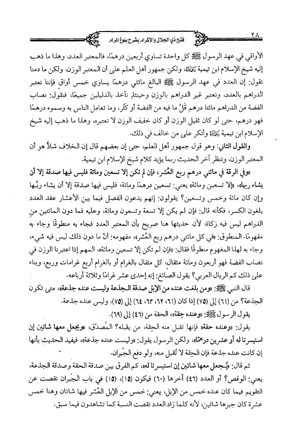 الأواقي في عهد الرسول صلى الله عليه وسلم كل واحدة تساوي أربعين درهمًا، فالمعتبر العدد، وهذا ما ذهب إليه شيخ الإسلام ابن تيمية رحمه الله، ولكن جمهور أهل العلم على أن المعتبر الوزن، ولكن ما دمنا نقول: إن العدد في عهد الرسول صلى الله عليه وسلم البالغ مائتي درهمًا يساوي خمس أواقٍ فإننا نعتبر الدراهم بالعدد، ونعتبر غير الدراهم بالوزن وحينئذٍ نأخذ بالدليلين جميعًا، فنقول: نصاب الفضة من الدراهم مائتا درهم قلَّ ما فيه من الفضة أو كثر، وما تعامل الناس به وسموه درهمًا فهو درهم، حتى لو كان ثقيل الوزن أو كان خفيف الوزن لا نعتبره، وهذا ما ذهب إليه شيخ الإسلام ابن تيمية رحمه الله وأنكر على من خالف في ذلك.