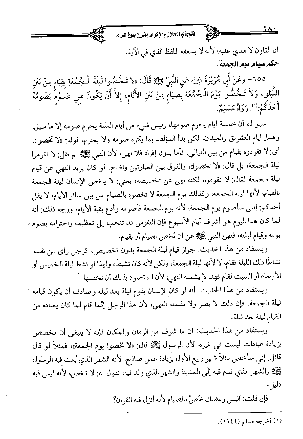 655 - وعن أبي هريرة رضي الله عنه عن النَّبيِّ صلى الله عليه وسلم قال: "لا تخضُّوا ليلة الجمعة بقيام من بين اللَّيالي، ولا تخضُّوا يوم الجمعة بصيامٍ من بين الأيَّام، إلاَّ أن يكون في صومٍ يصومه أحدكم". رواه مسلمٌ.