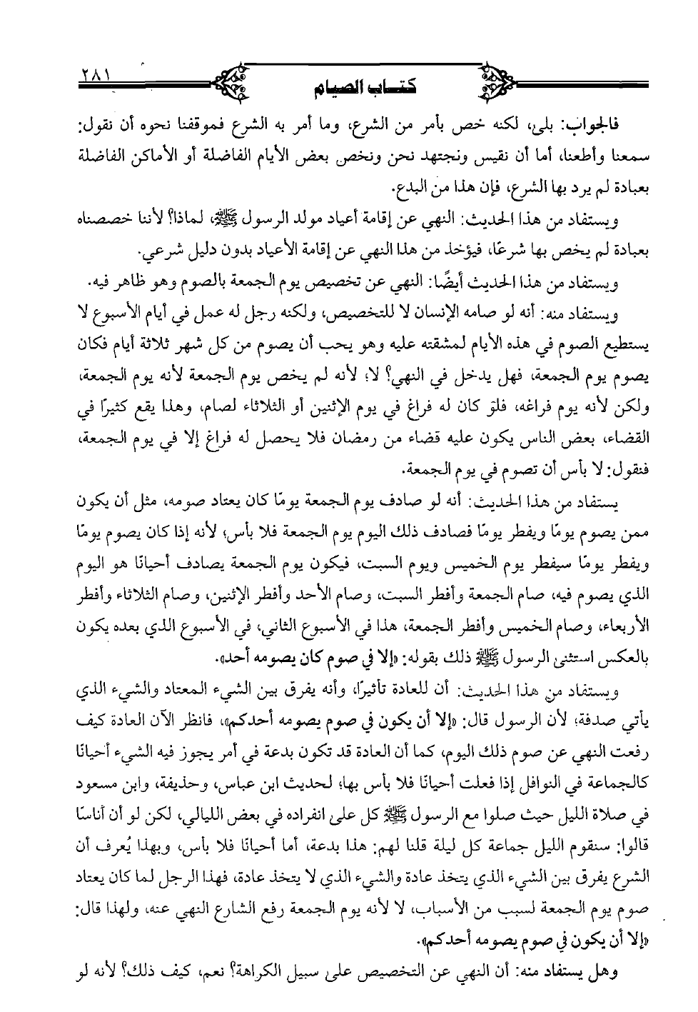 ويستفاد من هذا الحديث: أن للعادة تأثيرًا، وأنه يفرق بين الشيء المعتاد والشيء الذي يأتي صدفة؛ لأن الرسول قال: "إلا أن يكون في صوم يصومه أحدكم"، فانظر الآن العادة كيف رفعت النهي عن صوم ذلك اليوم، كما أن العادة قد تكون بدعة في أمر يجوز فيه الشيء أحيانًا كالجماعة في النوافل إذا فعلت أحيانًا فلا بأس به؛ لحديث ابن عباس، وحذيفة، وابن مسعود في صلاة الليل حيث صلوا مع الرسول صلى الله عليه وسلم كل على انفراده في بعض الليالي، لكن لو أن أناسًا قالوا: سنقوم الليل جماعة كل ليلة قلنا لهم: هذا بدعة، أما أحيانًا فلا بأس، وبهذا يعرف أن الشرع يفرق بين الشيء الذي يتخذ عادة والشيء الذي لا يتخذ عادة، فهذا الرجل لما كان يعتاد صوم يوم الجمعة لسبب من الأسباب، لا لأنه يوم الجمعة رفع الشارع النهي عنه، ولهذا قال: "إلا أن يكون في صوم يصومه أحدكم".