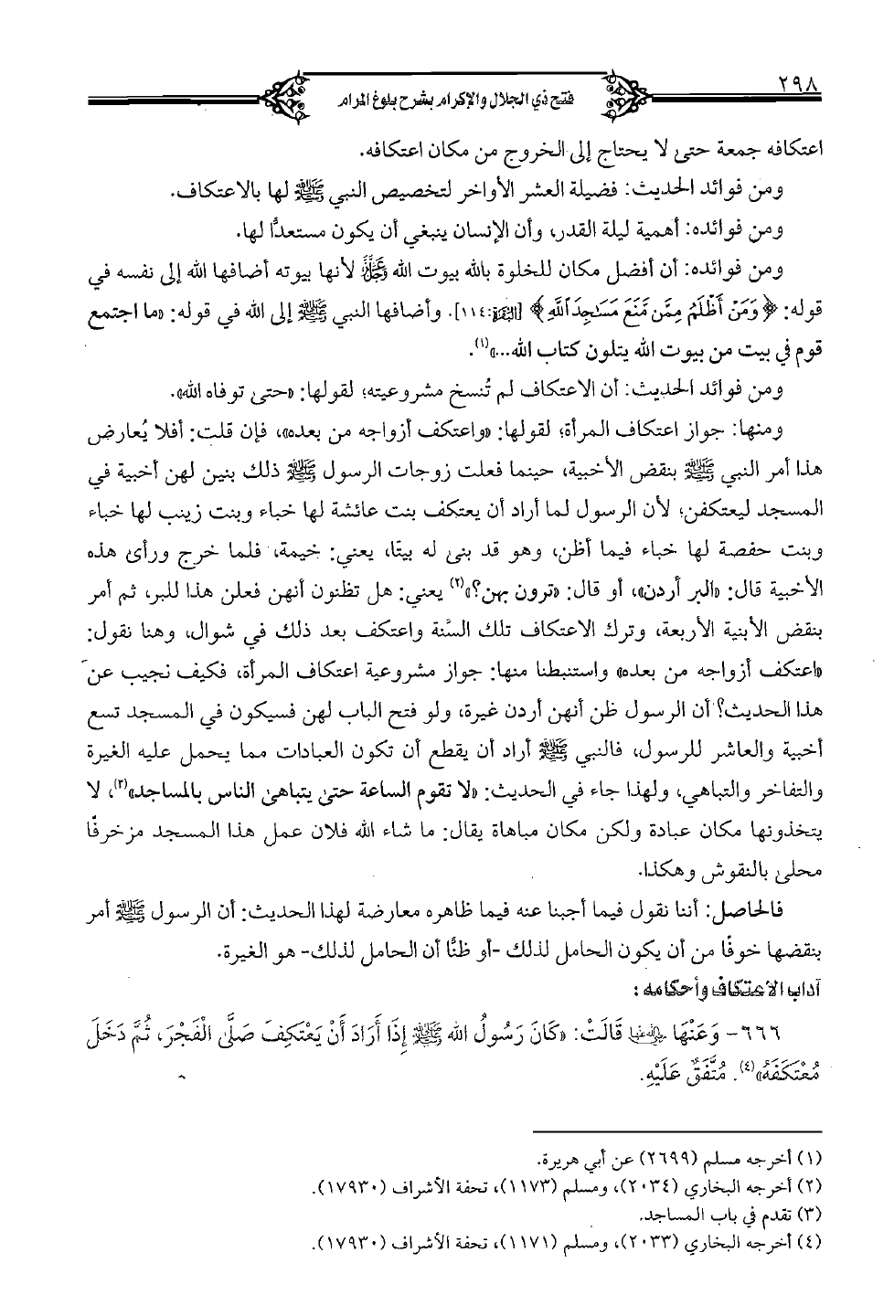 ومنها: جواز اعتكاف المرأة؛ لقولها: "واعتكف أزواجه من بعده"، فإن قلت: أفلا يعارض هذا أمر النبي صلى الله عليه وسلم بنقض الأخبية، حينما فعلت زوجات الرسول صلى الله عليه وسلم ذلك بنين لهن أخبية في المسجد ليعتكفن؛ لأن الرسول لما أراد أن يعتكف بنت عائشة لها خباء وبنت زينب لها خباء وبنت حفصة لها خباء فيما أظن، وهو قد بنى له بيتًا، يعني: خيمة، فلما خرج ورأى هذه الأخبية قال: "البر أردن"، أو قال: "ترون بهن؟ " يعني: هل تظنون أنهن فعلن هذا للبر، ثم أمر بنقض الأبنية الأربعة، وترك الاعتكاف تلك السِّنة واعتكف بعد ذلك في شوال، وهنا نقول: "اعتكف أزواجه من بعده" واستنبطنا منا: جواز مشروعية اعتكاف المرأة، فكيف نجيب عن هذا الحديث؟ أن الرسول ظن أنهن أردن غيرة، ولو فتح الباب لهن فسيكون في المسجد تسع أخبية والعاشر للرسول، فالنبي صلى الله عليه وسلم أراد أن يقطع أن تكون العبادات مما يحمل عليه الغيرة والتفاخر والتباهي، ولهذا جاء في الحديث: "لا تقوم الساعة حتى يتباهى الناس بالمساجد"، لا يتخذونها مكان عبادة ولكن مكان مباهاة يقال: ما شاء الله فلان عمل هذا المسجد مزخرفًا محلى بالنقوش وهكذا.