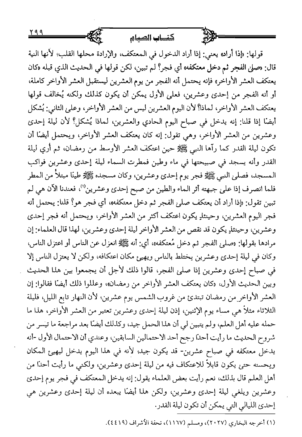 قولها: "إذا أراد" يعني: إذا أراد الدخول في المعتكف، والإرادة محلها القلب؛ لأنها النية قال: "صلى الفجر ثم دخل معتكفة" أي فجر؟ لم تبين، لكن قولها في الحديث الذي قبله "كان يعتكف العشر الأواخر" فإنه يحتمل أنه الفجر من يوم العشرين ليستقبل العشر الأواخر كاملة، أو أنه الفجر من إحدى وعشرين، فعلى الأول يمكن أن يكون كذلك ولكنه يُخالف قولها يعتكف العشر الأواخر، لماذا؟ لأن اليوم العشرين من العشر الأواخر، وعلى الثاني: يشكل أيضًا إذا قلنا: إنه يدخل في صباح اليوم الحادي والعشرين، لماذا يشكل؟ لأن ليلة إحدى وعشرين من العشر الأواخر، وهي تقول: إنه كان يعتكف العشر الأواخر، ويحتمل أيضًا أن تكون ليلة القدر كما رآها النبي صلى الله عليه وسلم حين اعتكف العشر الأوسط من رمضان، ثم أرى ليلة القدر وأنه يسجد في صبيحتها في ماء وطين فمطرت السماء ليلة إحدى وعشرين فواكب المسجد، فصلى النبي صلى الله عليه وسلم فجر يوم إحدى وعشرين، وكان مسجده صلى الله عليه وسلم طينًا مبتلًا من المطر فلما انصرف إذا على جبهته أثر الماء والطين من صبح إحدى وعشرين، فعندنا الآن هي لم تبين تقول: "إذا أراد أن يعتكف صلى الفجر ثم دخل معتكفة"، أي فجر هو؟ قلنا: يحتمل أنه فجر اليوم العشرين، وحينئٍذ يكون اعتكف أكثر من العشر الأواخر، ويحتمل أنه فجر إحدى وعشرين، وحينئٍذ يكون قد نقص من العشر الأواخر ليلة إحدى وعشرين، لهذا قال العلماء: إن مرادها بقولها: "صلى الفجر ثم دخل معتكفة"، أي: أنه صلى الله عليه وسلم انعزل عن الناس أو اعتزل الناس، وكان في ليلة إحدى وعشرين يختلط بالناس ويهيئ مكان اعتكافه، ولكن لا يعتزل الناس إلا في صباح إحدى وعشرين إذا صلى الفجر، قالوا ذلك لأجل أن يجمعوا بين هذا الحديث وبين الحديث الأول، "كان يعتكف العشر الأواخر من رمضان"، وعللوا ذلك أيضًا فقالوا: إن العشر الأواخر من رمضان تبتدئ من غروب الشمس يوم عشرين، لأن النهار تابع الليل، فليلة الثلاثاء مثلًا هي مساء يوم الإثنين، إذن ليلة إحدى وعشرين تعتبر من العشر الأواخر، هذا ما حمله عليه أهل العلم، ولم يتبين لي أن هذا الحمل جيد، وكذلك أيضًا بعد مراجعة ما تيسر من شروح الحديث ما رأيت أحدًا رجح أحد الاحتمالين السابقين، وعندي أن الاحتمال الأول- أنه يدخل معتكفة في صباح عشرين- قد يكون جيد؛ لأنه في هذا اليوم يدخل ليهيئ المكان ويحسنه حتى يكون قابلًا للاعتكاف فيه من ليلة إحدى وعشرين، ولكني ما رأيت أحدًا من أهل العلم قال بذلك، نعم رأيت بعض العلماء يقول: إنه يدخل المعتكف في فجر يوم إحدى وعشرين ويلغي ليلة إحدى وعشرين، ولكن هذا أيضًا يبعده أن ليلة إحدى وعشرين هي إحدى الليالي التي يمكن أن تكون ليلة القدر.