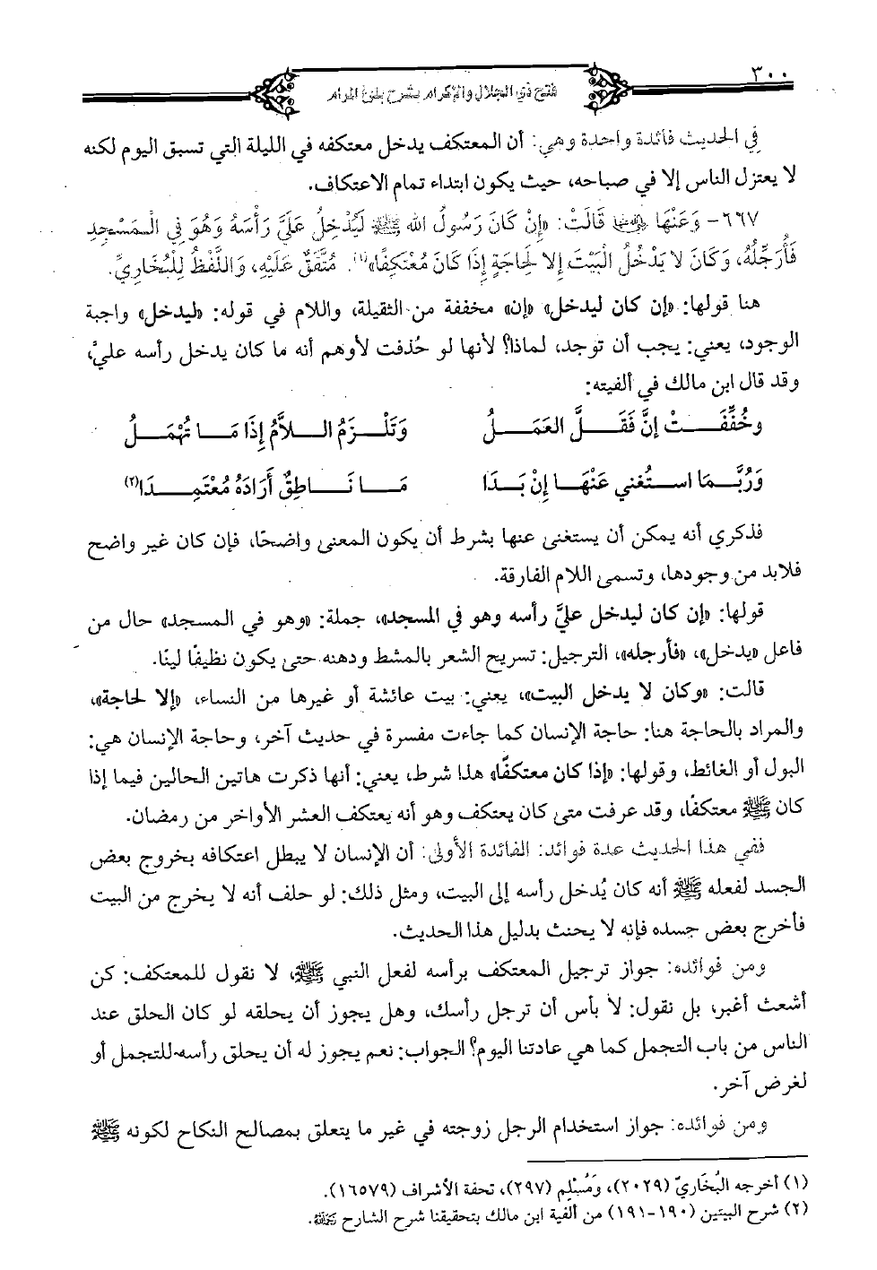 667 - وعنها رضي الله عنها قالت: "إن كان رسول الله صلى الله عليه وسلم ليدخل علىَّ رأسه وهو في المسجد فأرجِّله، وكان لا يدخل البيت إلا لحاجة إذا كان معتكفًا". متّفق عليه، واللَّفظ للبخاريِّ.