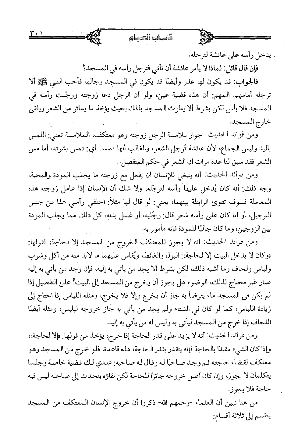 من هنا نبين أن العلماء- رحمهم الله- ذكروا أن خروج الإنسان المعتكف من المسجد ينقسم إلى ثلاثة أقسام: