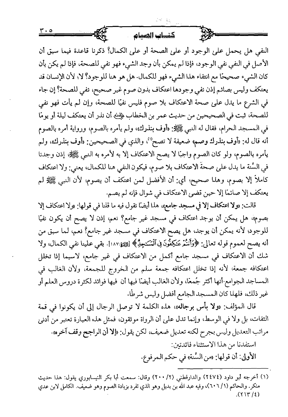 النفي هل يحمل على الوجود أو على الصحة أو على الكمال؟ ذكرنا قاعدة فيما سبق أن الأصل في النفي نفي الوجود، فإذا لم يمكن بأن وجد الشيء فهو نفي للصحة، فإذا لم يكن بأن كان الشيء صحيحًا مع انتفاء هذا الشيء فهو للكمال. هل هو هنا للوجود؟ لا؛ لأن الإنسان قد يعتكف وليس بصائم إذن نفي وجودها اعتكاف بدون صوم غير صحيح، نفي للصحة؟ إن جاء في الشرع ما يدل على صحة الاعتكاف بلا صوم فليس نفيًا للصحة، وإن لم يأت فهو نفي للصحة، ثبت في الصحيحين من حديث عمر بن الخطاب رضي الله عنه أن نذر أن يعتكف ليلة أو يومًا في المسجد الحرام، فقال النبي صلى الله عليه وسلم: "أوف بنذرك"، ولم يأمره بالصوم، ورواية أمره بالصوم أنه قال له: "أوف بنذرك وصم" ضعيفة لا تصح، والذي في الصحيحين: "أوف بنذرك"، ولم يأمره بالصوم، ولو كان الصوم واجبًا لا يصح الاعتكاف إلا به لأمره به النبي صلى الله عليه وسلم، إذن وجدنا في السٌنة ما يدل على صحة الاعتكاف بلا صوم، فيكون النفي هنا للكمال، يعني: ولا اعتكاف كاملًا إلا بصوم، وهذا صحيح؛ أي: أن الأفضل لمن اعتكف أن يصوم؛ لأن النبي صلى الله عليه وسلم لم يعتكف إلا صائمًا إلا حين قضى الاعتكاف في شوال فإنه لم يصم.