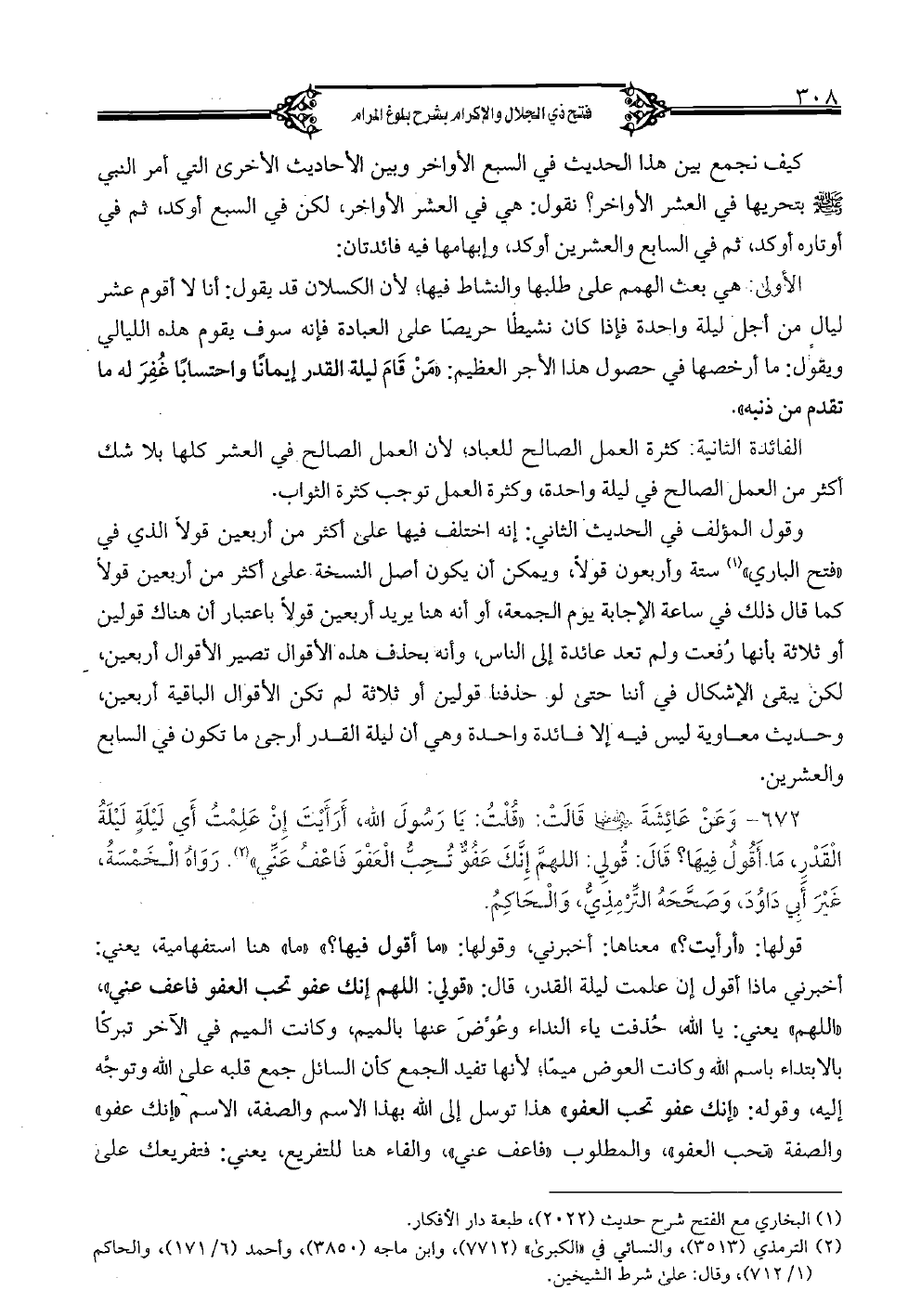 672 - وعن عائشة رضي الله عنها قالت: "قلت: يا رسول الله، أرأيت أن علمت أي ليلةٍ ليلة القدر، ما أقول فيها؟ قال: قولي: اللهم إنك عفوٌّ تحبُّ العفو فاعف عنِّي". رواه الخمسة، غير أبي داود، وصحَّحه التِّرمذيُّ، والحاكم.