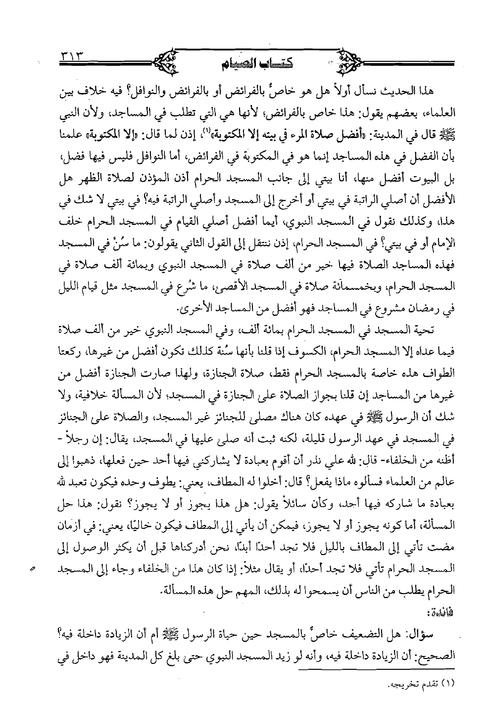 سؤال: هل التضعيف خاصٌّ بالمسجد حين حياة الرسول صلى الله عليه وسلم أم أن الزيادة داخلة فيه؟ الصحيح: أن الزيادة داخلة فيه، وأنه لو زيد المسجد النبوي حتى بلغ كل المدينة فهو داخل في