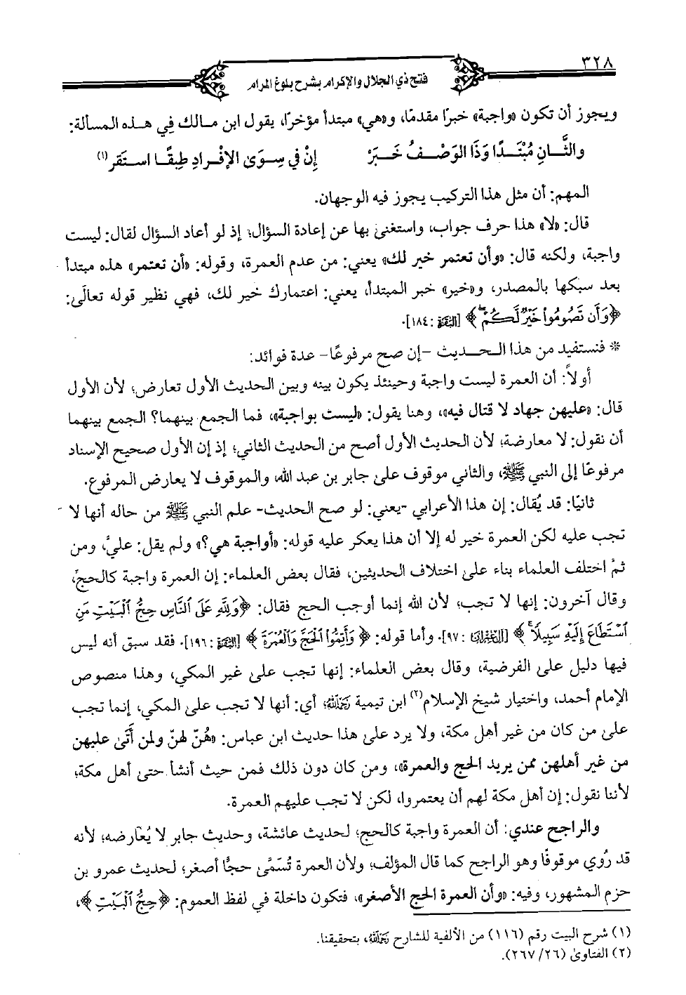 والراجح عندي: أن العمرة واجبة كالحج؛ لحديث عائشة، وحديث جابر لا يعارضه؛ لأنه قد روي موقوفًا وهو الراجح كما قال المؤلف؛ ولأن العمرة تسمَّى حجًّا أصغر؛ لحديث عمرو بن حزم المشهور، وفيه: "وأن العمرة الحج الأصغر"، فتكون داخلة في لفظ العموم: {حج البيت}،