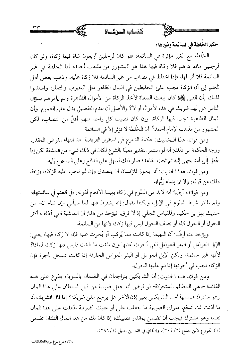 ومن فوائده أيضًا: أنه لا بد من السَّوم في زكاة بهيمة الأنعام لقوله: "في الغنم في سائمتها"، ولم يذكر شرط السَّوم في الإبل، ولكننا نقول: إنه يشترط فيها لما سيأتي- إن شاء الله- من حديث بهز بن حكيم وللقياس الجلي إذ لا فرق، فيؤخذ من هذا: أن الماشية التي تعلف أكثر الحول أو الحول كله أو نصف الحول ليس فيها زكاة؛ لأنها من السائمة.