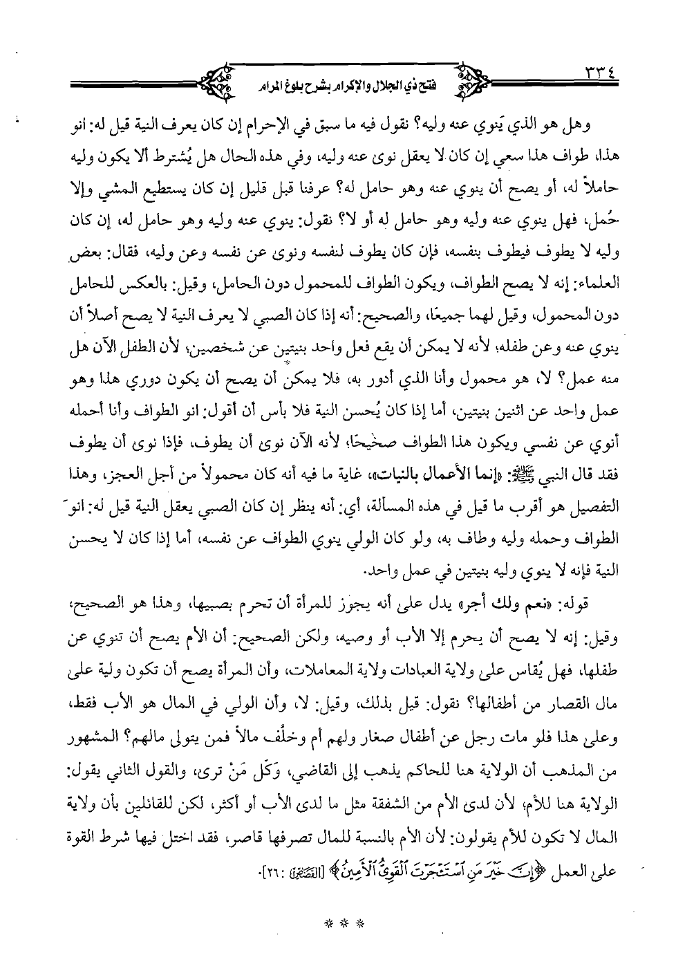 وهل هو الذي ينوي عنه وليها؟ نقول فيه ما سبق في الإحرام أن كان يعرف النية قيل له: أنو هذا، طواف هذا سعي أن كان لا يعقل نوى عنه وليه، وفي هذه الحال هل يشترط إلا يكون وليه حاملًا له، أو يصح أن ينوي عنه وهو حامل له؟ عرفنا قبل قليل أن كان يستطيع المشي وإلا حمل، فهل ينوي عنه وليه وهو حامل له أو لا؟ نقول: ينوي عنه وليه وهو حامل له، أن كان وليه لا يطوف فيطوف بنفسه، فإن كان يطوف لنفسه ونوى عن نفسه وعن وليه، فقال: بعض العلماء: إنه لا يصح الطواف، ويكون الطواف للمحمول دون الحامل، وقيل: بالعكس للحامل دون المحمول، وقيل لهما جميعًا، والصحيح: أنه إذا كان الصبي لا يعرف النية لا يصح أصلًا أن ينوي عنه وعن طفله؛ لأنه لا يمكن أن يقع فعل واحد بنيتين عن شخصين، لأن الطفل الآن هل منه عمل؟ لا، هو محمول وأنا الذي أدور به، فلا يمكن أن يصح أن يكون دوري هلا وهو عمل واحد عن اثنين بنيتين، أما إذا كان يحسن النية فلا بأس أن أقول: انو الطواف وأنا أحمله أنوي عن نفسي ويكون هذا الطواف صحيحًا؛ لأنه الآن نوى أن يطوف، فإذا نوى أن يطوف فقد قال النبي صلى الله عليه وسلم: "إنما الأعمال بالنيات"، غاية ما في أنه كان محمولًا من أجل العجز، وهذا الفصيل هو أقرب ما قال في هذه المسألة، أي: أنه ينظر أن كان الصبي يعقل النية قيل له: انو الطواف وحمله وليه وطاف به، ولو كان الولي ينوي الطواف عن نفسه، أما إذا كان لا يحسن النية فإنه لا ينوي وليه بنيتين في عمل واحد.