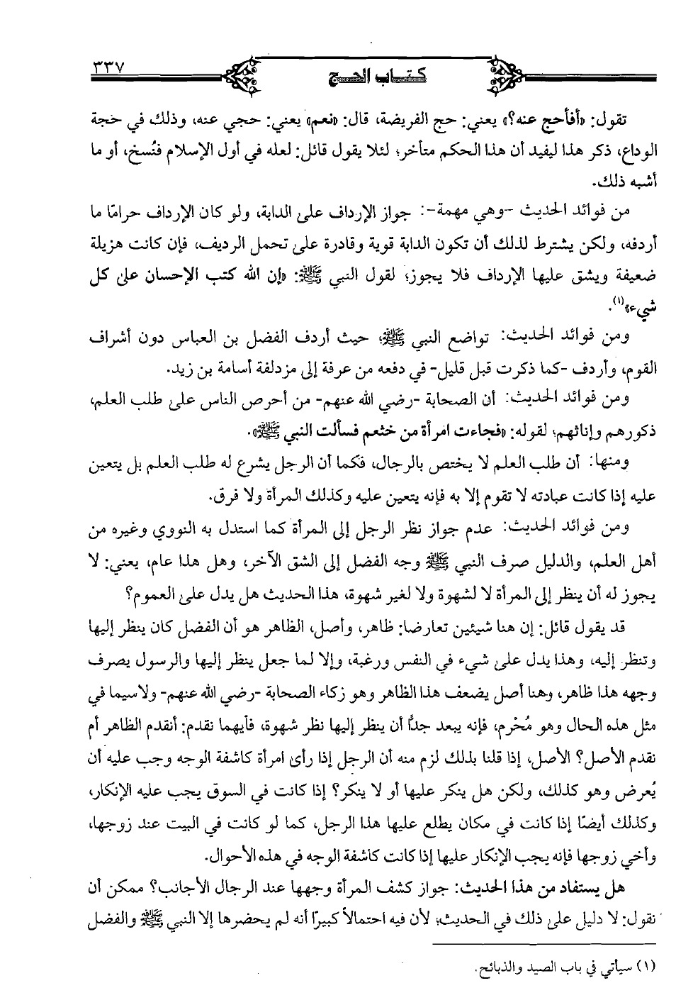 ومن فوائد الحديث: عدم جواز نظر الرجل إلى المرأة كما استدل به النووي وغيره من أهل العلم، والدليل صرف النبي صلى الله عليه وسلم وجه الفضل إلى الشق الآخر، وهل هذا عام، يعني: لا يجوز له أن ينظر إلى المرأة لا لشهوة ولا لغير شهوة، هذا الحديث هل يدل على العموم؟