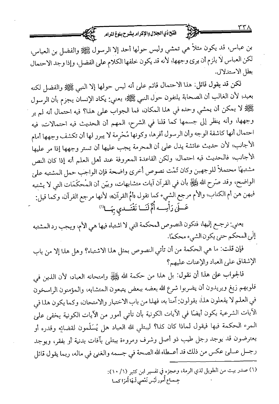 لكن قد يقول قائل: هذا الاحتمال قائم على أنه ليس حولها إلا النبي صلى الله عليه وسلم والفضل لكنه بعيد؛ لأن الغالب أن الصحابة يلتفون حول النبي صلى الله عليه وسلم، يعني: يكاد الإنسان يجزم بأن الرسول صلى الله عليه وسلم لا يمكن أن يمشي وحده في هذا المكان، فما الجواب على هذا؟ فيه احتمال أنه لم ير وجهها، وأنه ينظر إلى جسمها كما قلنا في الشرح، المهم أن الحديث فيه احتمالات، فيه احتمال أنها كاشفة الوجه وأن الرسول أقرها، وكونها محرمة لا يبرر لها أن تكشف وجهها أمام الأجانب؛ لأن حديث عائشة يدل على أن المحرمة يجب عليها أن تستر وجهها إذا مر عليها الأجانب، فالحديث فيه احتمال، ولكن القاعدة المعروفة عند أهل العلم أنه إذا كان النص مشتبهًا محتملًا للوجهين وكان تمَّت نصوص أخرى واضحة فإن الواجب حمل المشتبه على الواضح، وقد صرح الله عز وجل بأن في القرآن آيات متشابهات، وبين أن المحكمات التي لا يشتبه فيهن هن أم الكتاب والأم مرجع الشيء كما نقول "أم القرآن"؛ لأنها مرجع القرآن، وكما قيل: