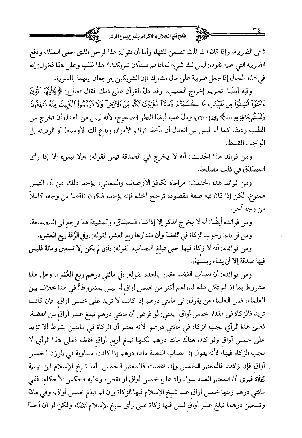 ومن فوائده: أن نصاب الفضة مقدر بالعدد لقوله: "في مائتي درهم ربع العشرة"، وهل هذا مشروط بما إذا لم تكن هذه الدراهم أكثر من خمس أواقٍ أو ليس بمشروط؟ في هذا خلاف بين العلماء، فمن العلماء من يقول: في مائتي درهم إذا كانت لا تزيد على خمس أواقٍ، فإن كانت تزيل فالزكاة في مقدار خمس أواقٍ، يعني: لو فرض أن مائتي درهم تبلغ عشر أواقٍ من الفضة، فعلى هذا الرأي تجب الزكاة في مائتي درهم؛ لأنه يعتبر أن الزكاة في مائتين بشرط ألا تزيد على خمس أواقٍ ولو كان هناك مائتا درهم لكنها تبلغ أربع أواقٍ فقط، فعلى هذا الرأي لا تجب الزكاة فيها؛ لأنه يقول إن نصاب الفضة مائتا درهم إذا كانت مساوية في الوزن لخمس، أواق فإن زادت فالمعتبر الخمس وإن نقصت فالمعتبر الخمس، أما شيخ الإسلام ابن تيمية رحمه الله فيرى أن المعتبر العدد سواء زاد على خمس أواق أو نقص، وعليه فنعكس الأحكام، ففي مائتي درهم زنتها خمس أواقٍ عند شيخ الإسلام فيها الزكاة وإن لم تبلغ خمس أواقٍ، وفي مائة وتسعين درهمًا تبلغ عشر أواقٍ ليس فيها زكاة على رأي شيخ الإسلام رحمه الله، ولكن لو أن أحداً
