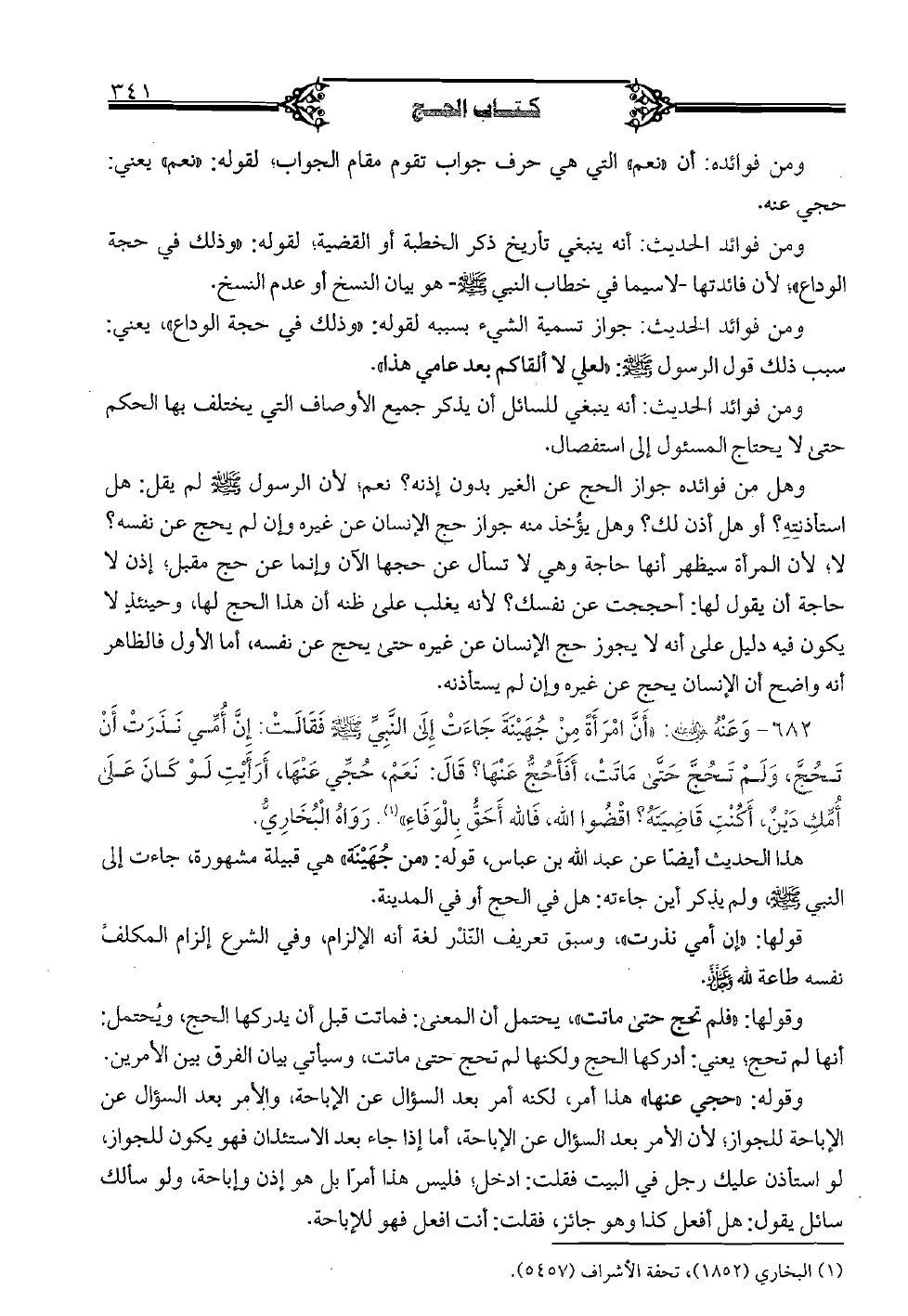 682 - وعنه رضي الله عنه: "أن امرأة من جهينة جاءت إلى النَّبيِّ صلى الله عليه وسلم فقالت: إنَّ أمِّي نذرت أن تحجَّ، ولم تحجَّ حتَّى ماتت، أفأحجُّ عنها؟ قال: نعم، حجِّي عنها، أرأيت لو كان على أمِّك دينٌ، أكنت قاضيته؟ اقضوا الله، فالله أحقُّ بالوفاء" (). رواه البخاريُّ.